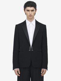 Single-breasted jacket in black wool barathea. Peak lapels, chest pocket and two jet pockets. Finished with a T-bar chain front closure. Complete the look with the matching trousers. Product details - Peak lapels - Side flap pockets - Single button fastening - Made with certified wool yarn - Product code: 822415QVAAA1000 - Made in Italy - Material: Wool
