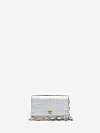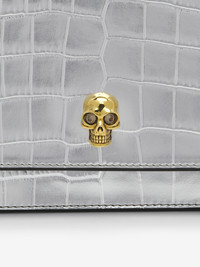The Small Skull Bag – structured body in metallic silver calf leather with a shiny finishing, embossed with a crocodile-effect print with a skull-embellished flap. This bag can be worn cross-body with the two-tone chain strap. Product details - Dimensions: 19 x 13 x 5 cm / 7.4 x 5.1 x 1.9 inches - Magent fastening - One central compartment and one card pocket - Antique gold and antique silver-finished chain strap - Accommodates smartphones - Product code: 61308814C311402 - Made in Italy - Material: Calf Leather