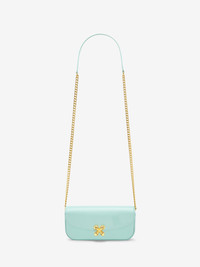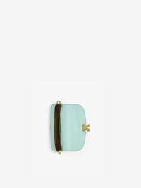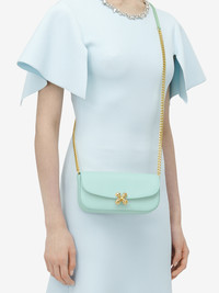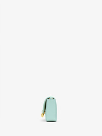 The Small McQueen Skull Flower Bag – elongated east-west silhouette crafted from spearmint calf leather. Rounded flap with crystal-embellished McQueen Skull Flower. The bag can be worn cross-body using the leather and chain strap. Product details - Dimensions: Length 21 x Height 8 x Depth 4 cm / 8.3 x 3.1 x 1.6 inches - Strap drop: 56 cm / 22 inches - McQueen lettering on the back - Magnetic fastening - One main compartment with card slot - Brass hardware with shiny gold finishing - Light pink suede-effect lining - Product code: 8360371MAAE3420 - Made in Italy - Material: Calf Leather