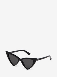 Black acetate sunglasses fitted with solid smoke lenses. The sunglasses have a sharp cat-eye shape and feature a lasered McQueen logo with silver enamel on the thin temples. All Alexander McQueen Eyewear is 100% certified UV protective (UVA and UVB rays). Product details - The Eastman Acetate Renew used in this style includes 27% recycled material achieved via mass balance approach. - Product code: 832519J07491056 - Made in Italy - Material: Recycle Acetate & Bio Nylon Lens