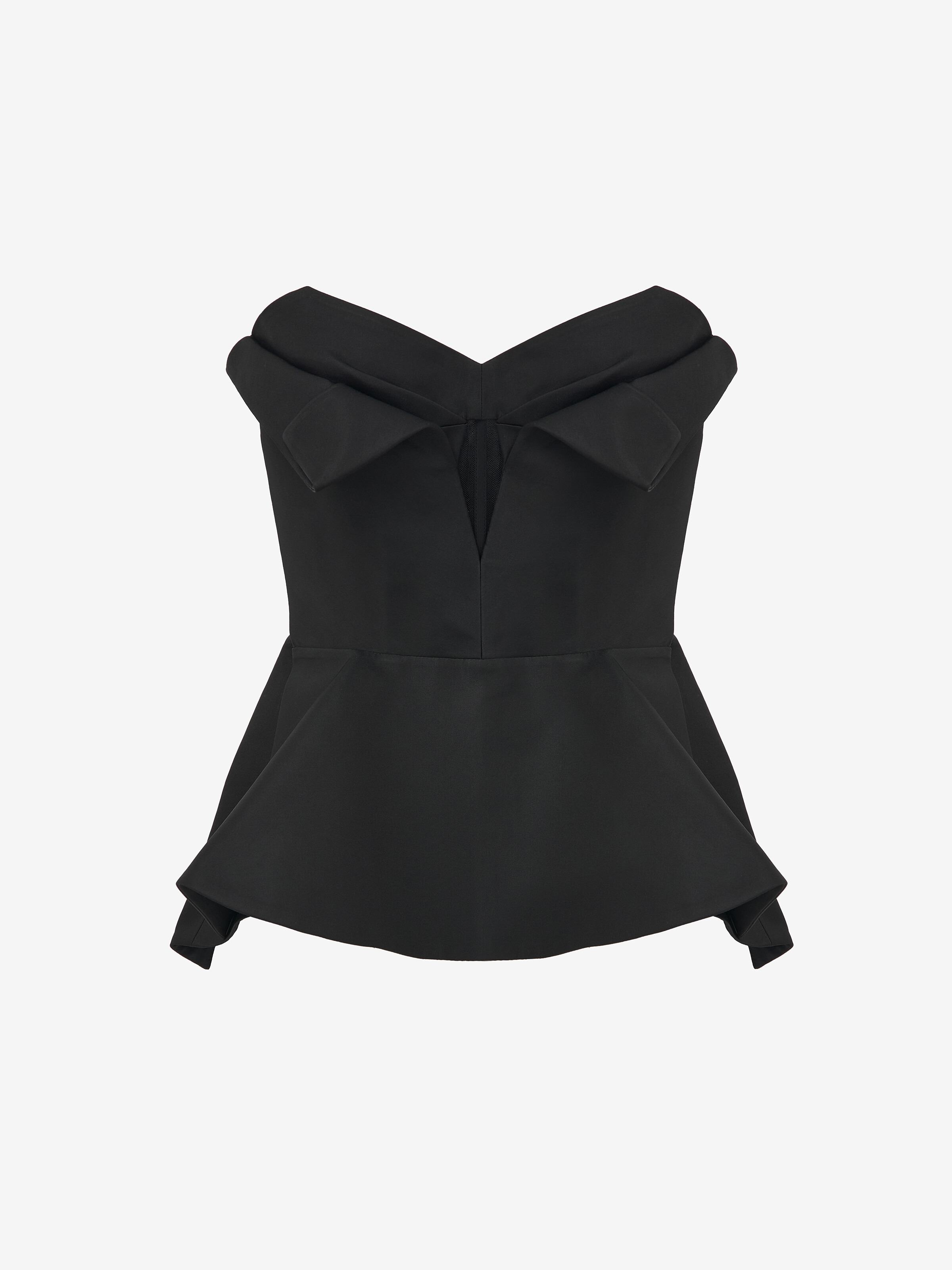 Strapless corset top in black poly silk duchesse. Sculptural draping at the neckline, structured bodice with cut-out detailing and flared peplum hem. Finished with a back zip fastening. Product details - Sweetheart neckline - Cut-out detailing - Back zip fastening - Product code: 839622QEAGH1000 - Made in Italy - Material: 61% Polyester, 39% Silk