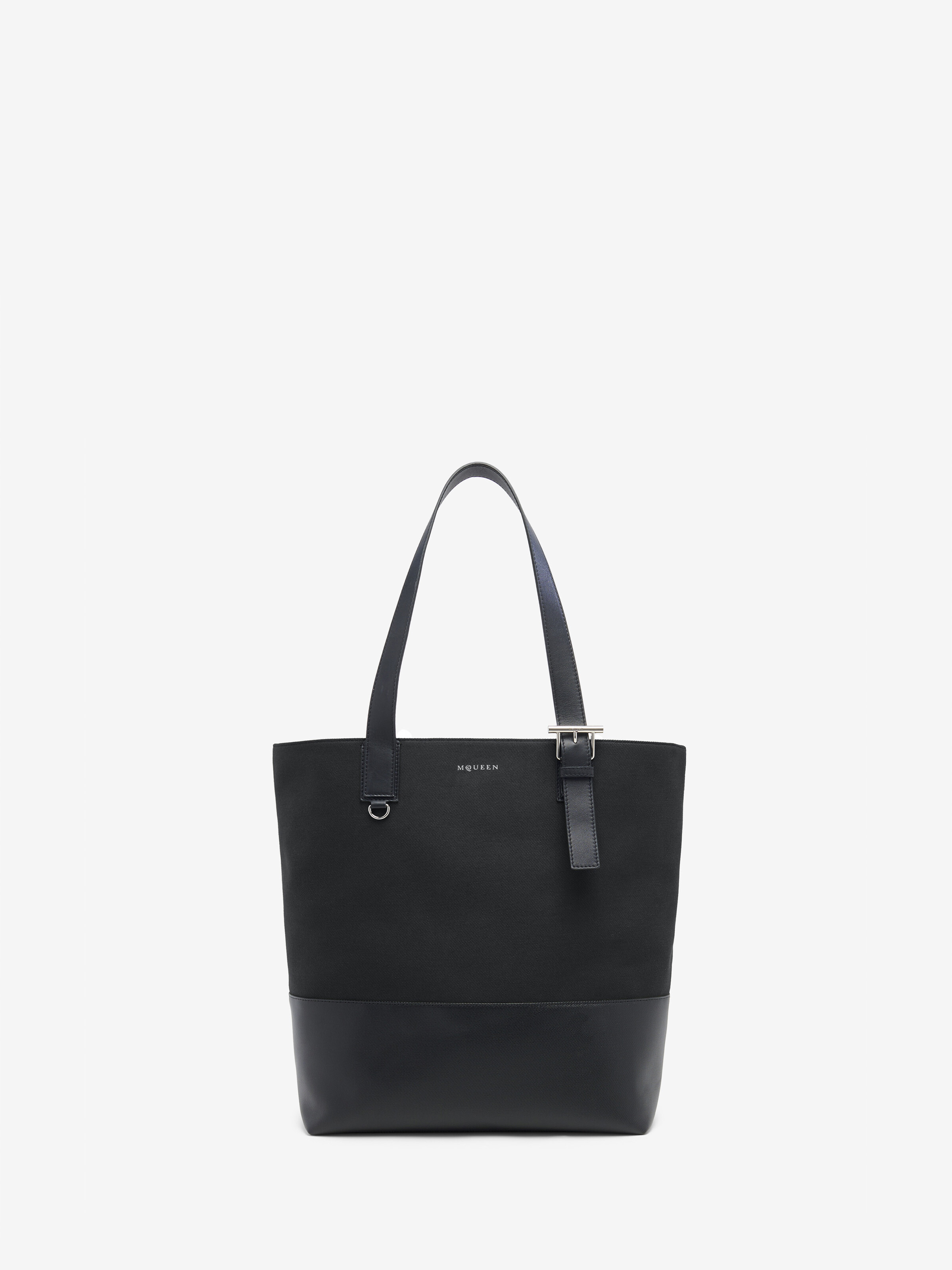 The T-Bar Shopper—crafted from black drill canvas with a coated bottom. Statement T-Bar buckle in silver metal engraved with the McQueen logo. The bag can be carried on the shoulder using the leather handles. Product details - Dimensions: Length 34 x Height 41 x Depth 17 cm / 13.3 x 16.1 x 6.6 inches - Silver tone metal T-Bar buckle - Handle drop: 27 cm / 10.6 inches - T-Bar length: 6 cm / 2.3 inches - McQueen lettering on the front - One central compartment - Internal pocket - Internal card slot - Metal D-ring - Canvas lining - Product code: 8360691AAU21000 - Made in Italy - Material: 98% Cotton, 2% Polyurethane