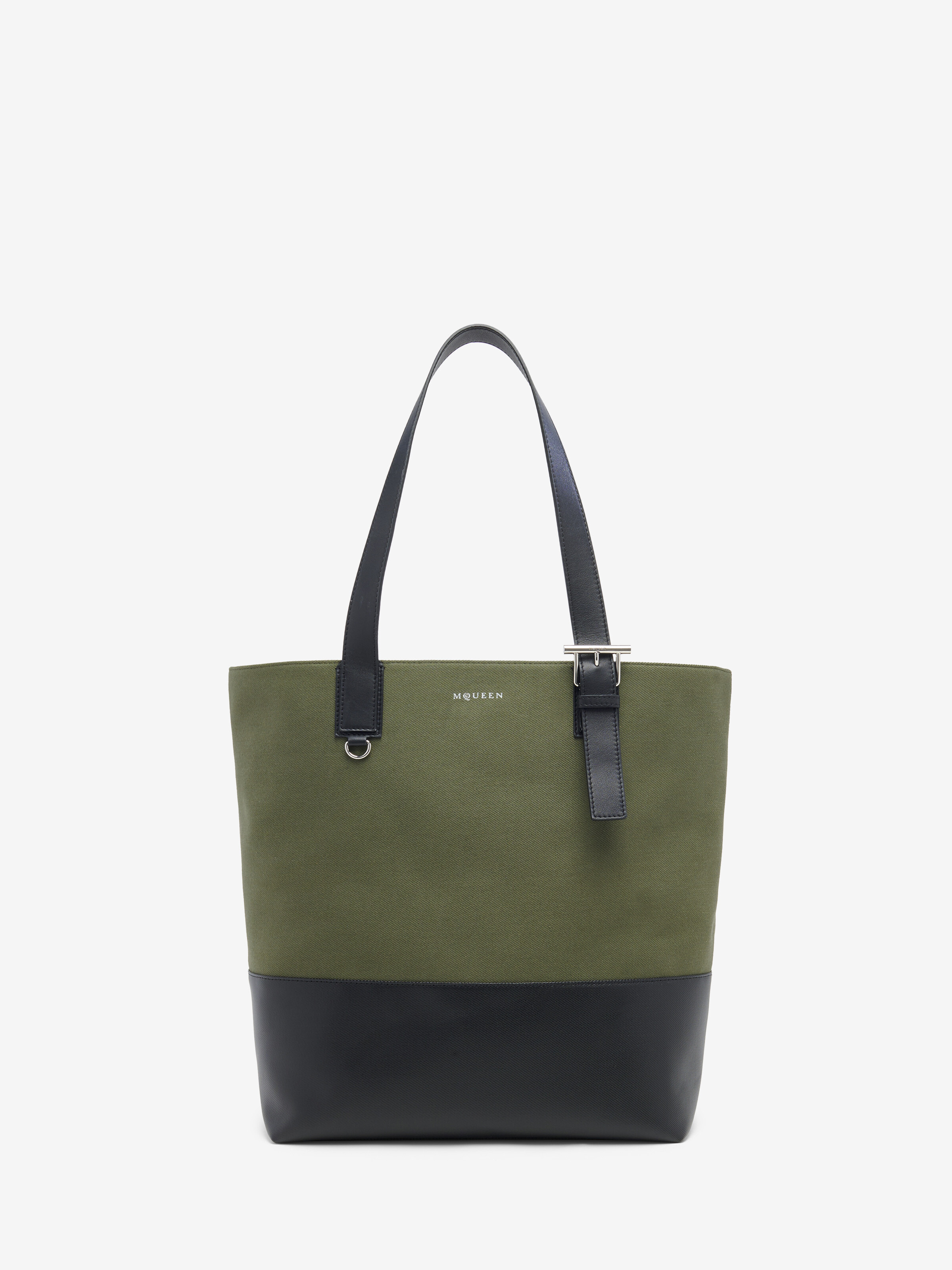 The T-Bar Shopper—crafted from khaki drill canvas with a coated bottom. Statement T-Bar buckle in silver metal engraved with the McQueen logo. The bag can be carried on the shoulder using the leather handles. Product details - Dimensions: Length 34 x Height 41 x Depth 17 cm / 13.3 x 16.1 x 6.6 inches - Silver tone metal T-Bar buckle - Handle drop: 27 cm / 10.6 inches - T-Bar length: 6 cm / 2.3 inches - McQueen lettering on the front - One central compartment - Internal pocket - Internal card slot - Metal D-ring - Canvas lining - Product code: 8360691AAU22360 - Made in Italy - Material: 98% Cotton, 2% Polyurethane