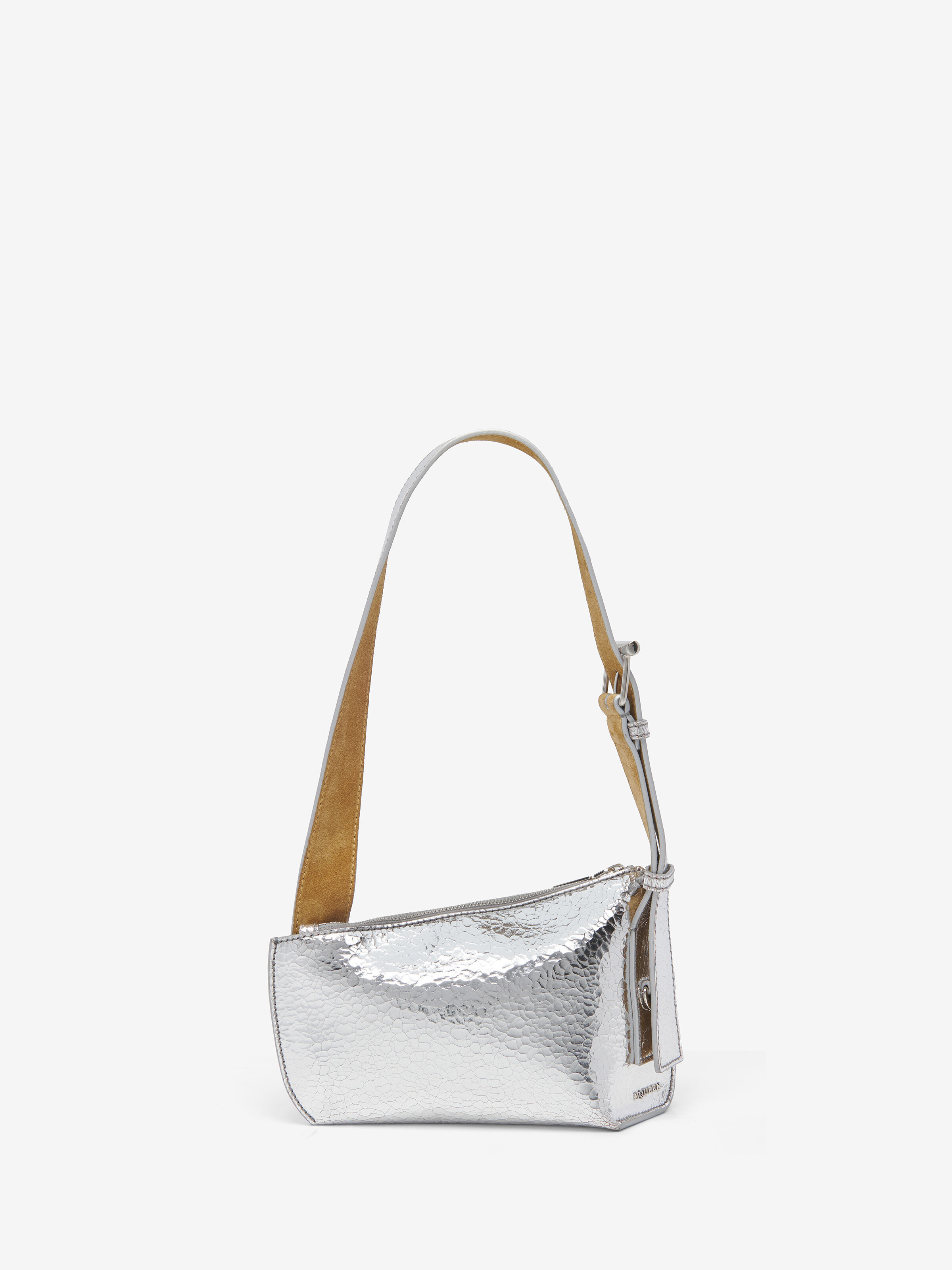 The McQueen T-Bar Sling pouch – asymmetrical and handcrafted from a single piece beige suede calf leather covered with a metallic silver coating with a crackled effect. Can be worn on the shoulder using the adjustable leather strap. Detailed with a statement T-Bar buckle in silver tone metal engraved with the McQueen logo. Product details - Dimensions: Length 20 x Height 11-13 x Depth 0.5-7 cm / 7.8 x 4.3-5.1 x 0.1-2.7 inches - Adjustable leather strap with silver tone metal T-Bar buckle - Strap drop: 23-33 cm / 9-12.9 inches - T-Bar length: 6.5 cm / 2.5 inches - McQueen metal lettering and external metal D-ring on the side - Zip fastening - One central zip compartment with card slot and metal D-ring - Beige suede calf leather lining - Product code: 8135351AAWW1402 - Made in Italy - Material: Calf Leather