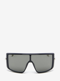 Black acetate sunglasses fitted with solid smoke lens and with silver metal tone temples . The sunglasses have an oversize visor shape and feature T-Bar detailing interpreted as a temple and finished with the lasered McQueen logo. All Alexander McQueen Eyewear is 100% certified UV protective (UVA and UVB rays). Product details - Product code: 852607J07701055 - Made in JAPAN - Material: Metal