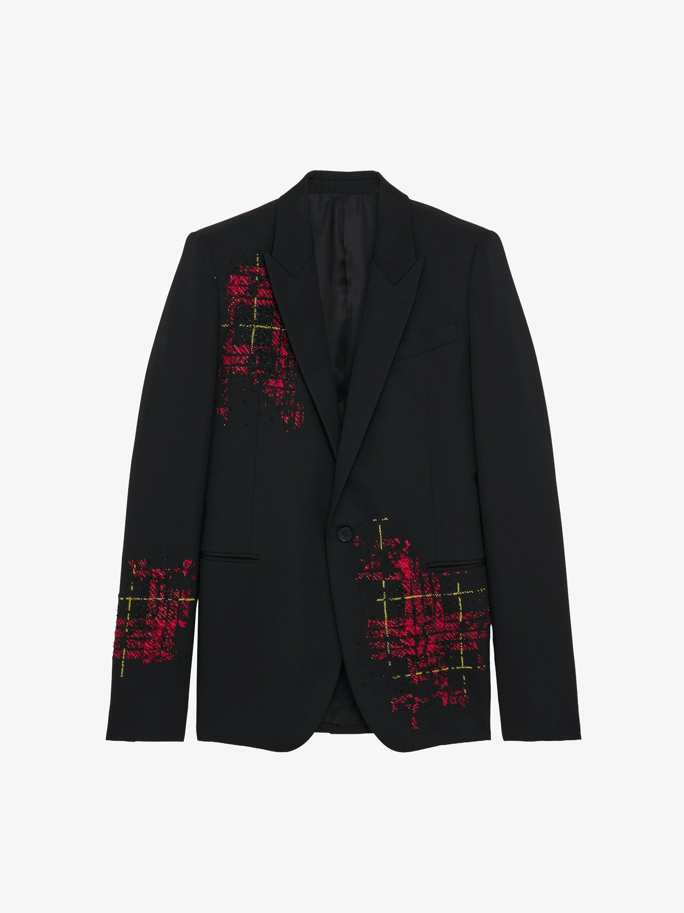 Single-breasted jacket in black Japanese wool barathea. Tartan-inspired embroidery on the front made with glass beads, jet beads and metallic thread. Peak lapels, chest pocket and two jetted pockets on the sides. Finished with a T-Bar chain back detail. Product details - Peak lapels - Side jetted pockets - Single button fastening - Product code: 857124QVAAA1000 - Made in ITALY - Material: 100% Wool
