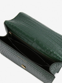 Shiny emerald green embossed croc calfskin leather Jewelled Satchel. This bag can be worn in multiple ways: carry it in your hand using the ring handle or by doubling up the strap. Alternatively, wear over the shoulder or across the body using the leather and chain strap. Product details - Dimensions: 24 x 14.5 x 8 cm / 9.4 x 5.7 x 3.1 inches - Gold four-ring embellishment encrusted with crystals - Two compartments and one flat zip pocket - Adjustable leather and chain strap - Antique gold chain strap - Brass hardware with antique gold finish - Suede-effect lining - Can accommodate a smartphone - Due to the appearance of the product, we recommend stowing it in your hold luggage when passing through airport security. For the same reason we recommend not taking the bag to public places, such as law courts and sports stadiums, where there may be security checks - Product code: 5541281HB003120 - Made in Italy - Material: 100% Calf Leather