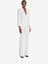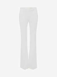 Ivory bootcut trousers in leaf crepe featuring side pockets and a welt pocket on the back. The trousers are finished with a concealed zip and hook fastening. Product details - Please note, standard Alexander McQueen packaging is not available on employee sale purchases. - All sales are final and may not be returned or exchanged. Some products may present slight imperfections and all products are sold on an “as is”, final sale basis. - All products purchased by the employees are strictly personal and may not be resold. Failure to comply with the Policy will result in serious disciplinary measures. - Product code: 585101QEAAA9007 - Made in Italy - Material: 52% Viscose, 48 % Acetate