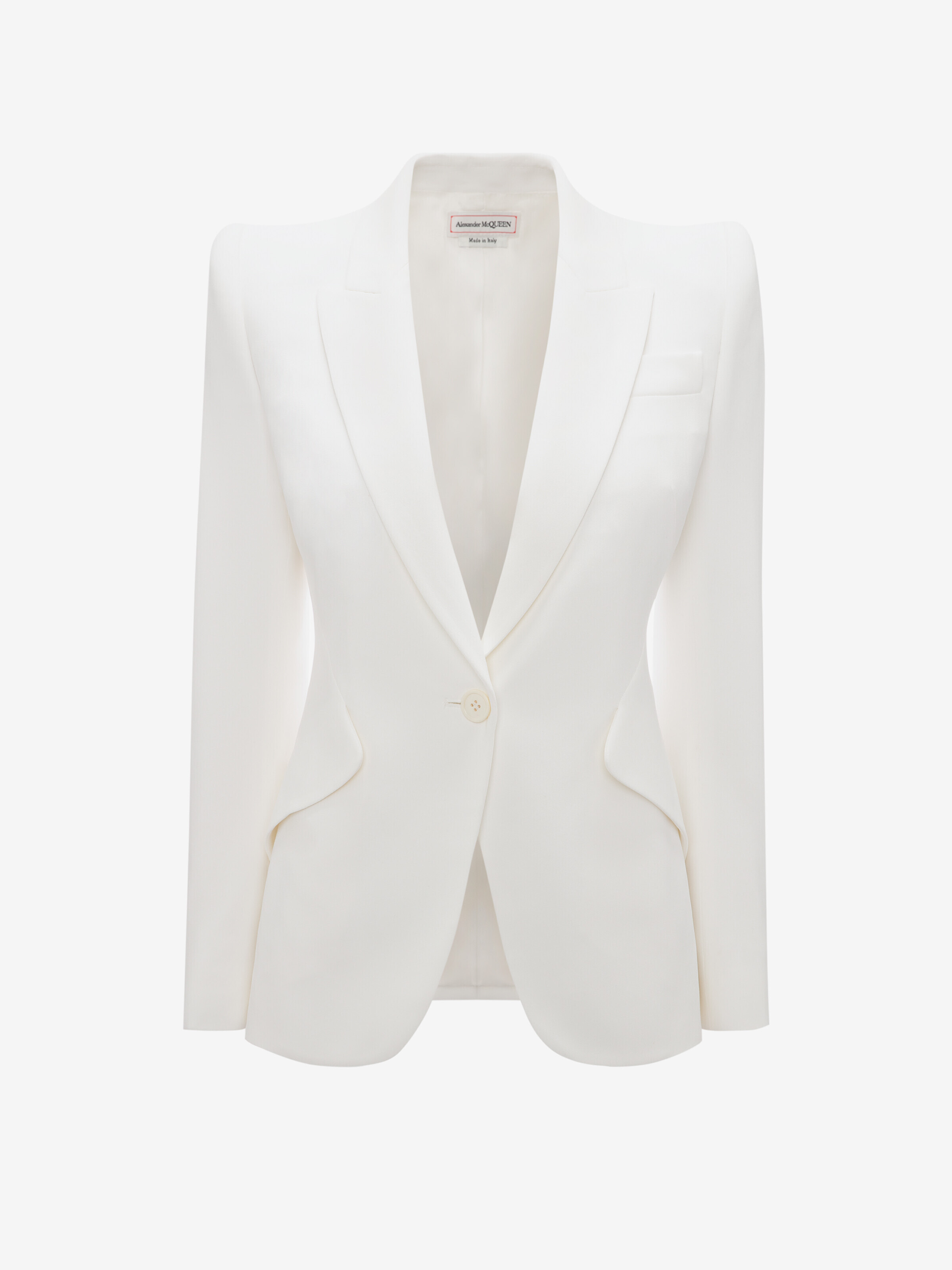 Peak shoulder single-breasted jacket in ivory leaf crepe. The jacket features peak lapels, side flap pockets and a single button fastening. Product details - Peak lapels - Slit pocket on the chest - Single button fastening - Fits true to size - Made with certified viscose and acetate yarns - Product code: 585442QEAAA9007 - Made in Italy - Material: 52% Viscose, 48% Acetate