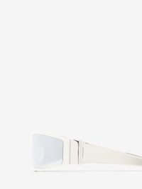 Wraparound mask sunglasses in silver metal with mirrored silver lens. The sunglasses are detailed with a statement silver metal T-Bar on the hinge finished with a lasered McQueen logo. All Alexander McQueen Eyewear is 100% certified UV protective (UVA and UVB rays). Product details - Product code: 821679I33101273 - Made in Japan - Material: Metal