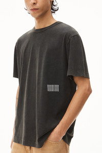 short-sleeve acid wash high twist jersey tee with repeating logo print at hem - ribbed trim at neck - relaxed fit - hits at hip - 100% cotton - model is 6'2" and wears size m - made in vietnam - UCC3211011007