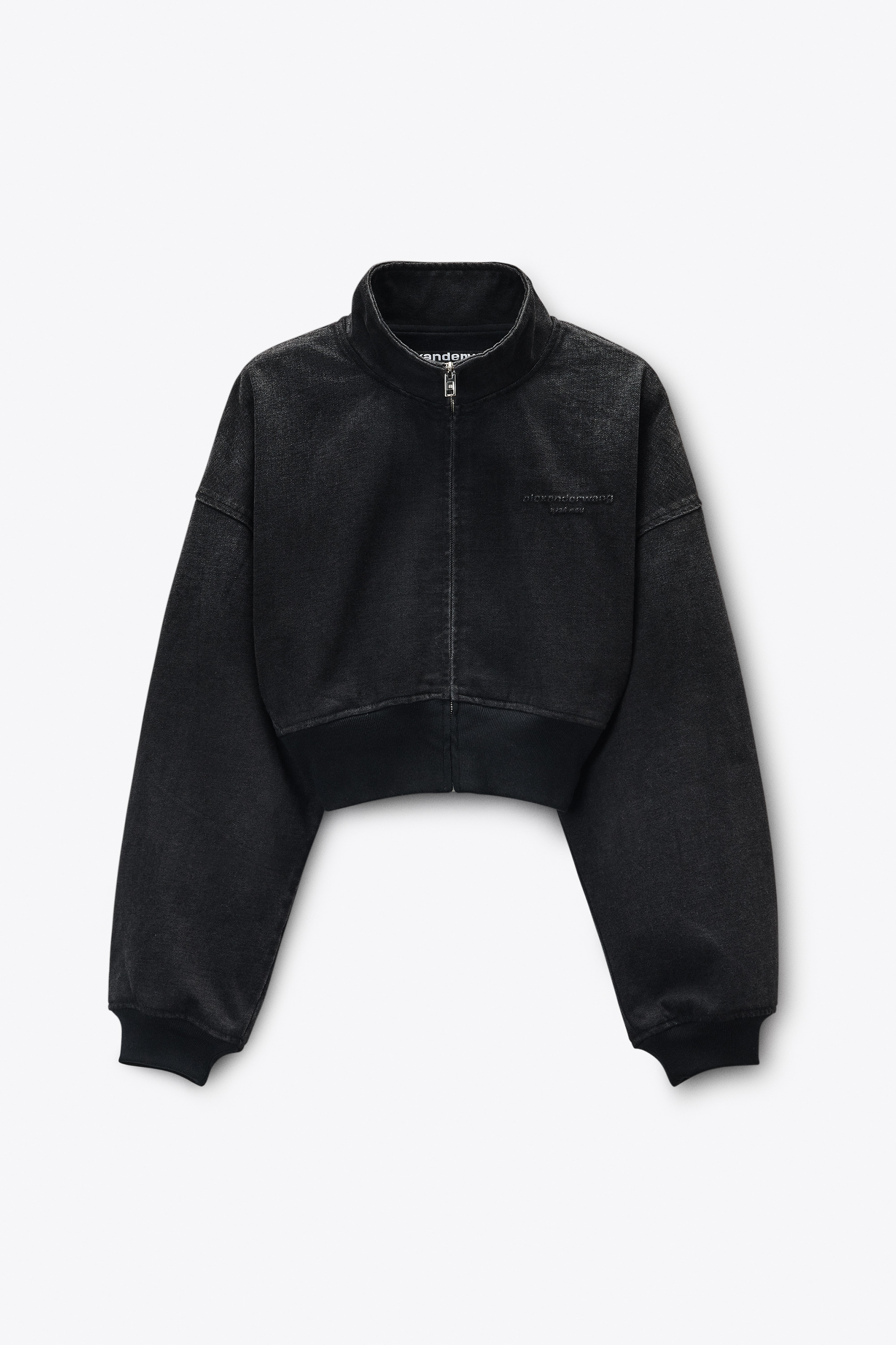 Funnel neck jacket in washed black brushed indigo denim, designed with a dropped shoulder and loose fit. Cropped and cinched at the waist with a tall ribbed hem, it features a zip front closure and a silicone-filled classic logo at the chest. - funnel neckline - zip front closure - dropped shoulder construction - loose, cropped fit - wide ribbed hem - model is 5'11" and wears a size S - body composition: 59% cotton / 41% polyester - made in China - 4DC4252922020A composition Body: 59%COTTON/41%POLYESTER Rib: 65%COTTON/27%POLYESTER/8%ELASTANE Lining: 100%COTTON