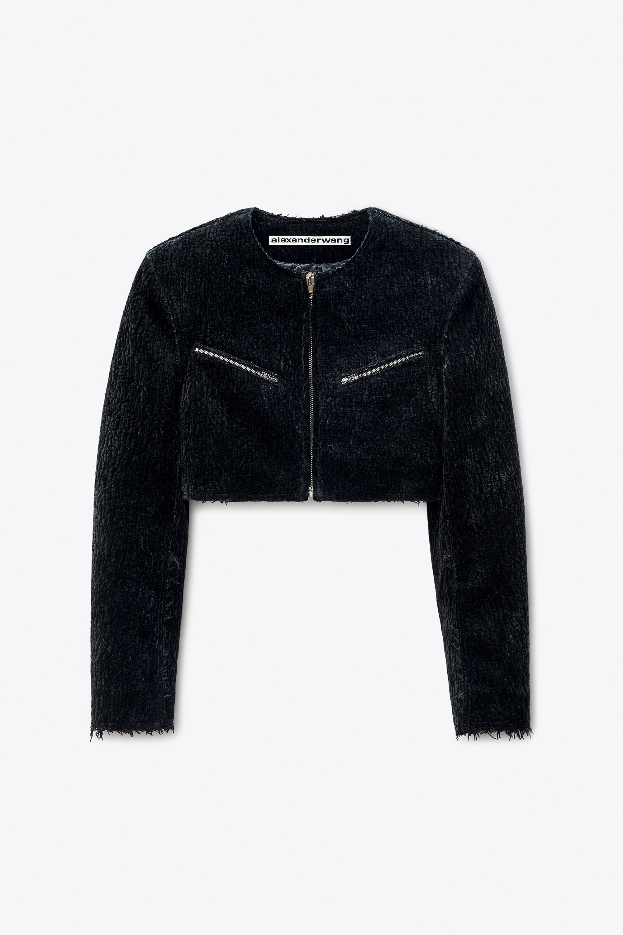 Black bubble grain velvet collarless jacket with a cropped, boxy silhouette. Detailed with raw edges and triple-needle stitching, it’s finished with a front zip and faux leather logo patch at the back neck. - collarless - front-zip closure - zip welt pockets - raw edge finish at cuffs, hem, and neckline - boxy cropped fit - fully lined - body composition: 100% polyester - model is 5'11" and wears a size s - made in China - 1WC4252671001 composition Body: 100%POLYESTER Lining: 65%ACETATE/35%VISCOSE Filling: 100%POLYESTER