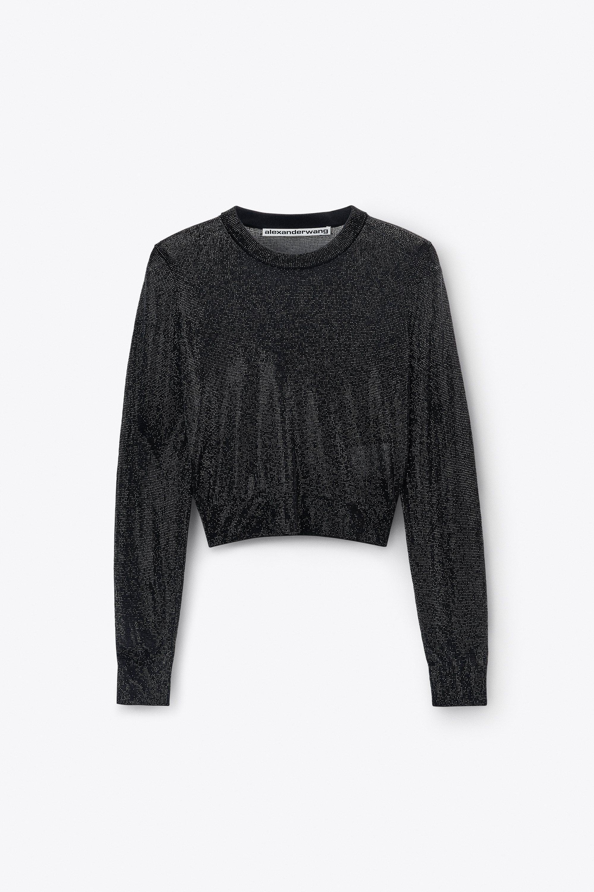 Black matte rayon pullover in a fine gauge jersey stitch with a crew neckline and long sleeves. Covered in over 160,000 crystal hotfix embellishments, this waist-length knit features classic 1x1 rib trims and delivers a hand-finished look with elevated texture. - crewneck - long sleeves - hits at waist - 100% viscose - made in China - model is 5'11" and wears a size s - 1KC4251070001 composition Body: 100%VISCOSE Rib: 77%VISCOSE/21%POLYAMIDE/2%ELASTANE