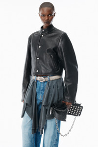 Cropped moto jacket in black vintage glossy leather with a snap front closure and vented back. Designed with a stand collar, curved articulated sleeves with gusseted vents, and besom pockets at the front. Finished with a logo patch at the back neck and lined interior. - stand collar - center front snap closure - articulated curved sleeves with gusseted vents - besom pockets at front - vented back - lined - body composition: cow leather - model is 5'11" and wears a size S - made in India - 1WC4252687001 composition Body: 100%COW LEATHER Lining: 100%COTTON
