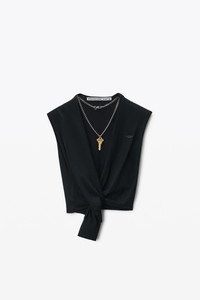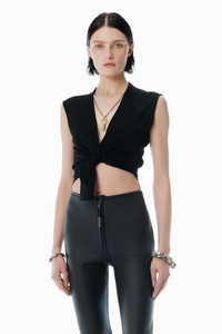 A detachable logo nameplate at the neck characterizes this deep V-neck black top, with self-edge trim at the neckline for a cut-off effect. Crafted from superfine RWS merino, this style features a relaxed, fine-gauge, structured-stitched finish with sweater-rib trim. - V-neck - relaxed fit, hits above waist - body composition: 100% wool - made in china - model is 5'10" and wears a size s - 1KC3251003001 composition Body: 100%WOOL (OVIS ARIES ARIES) Trim: 81%WOOL (OVIS ARIES ARIES)/17%POLYAMIDE/2%ELASTANE