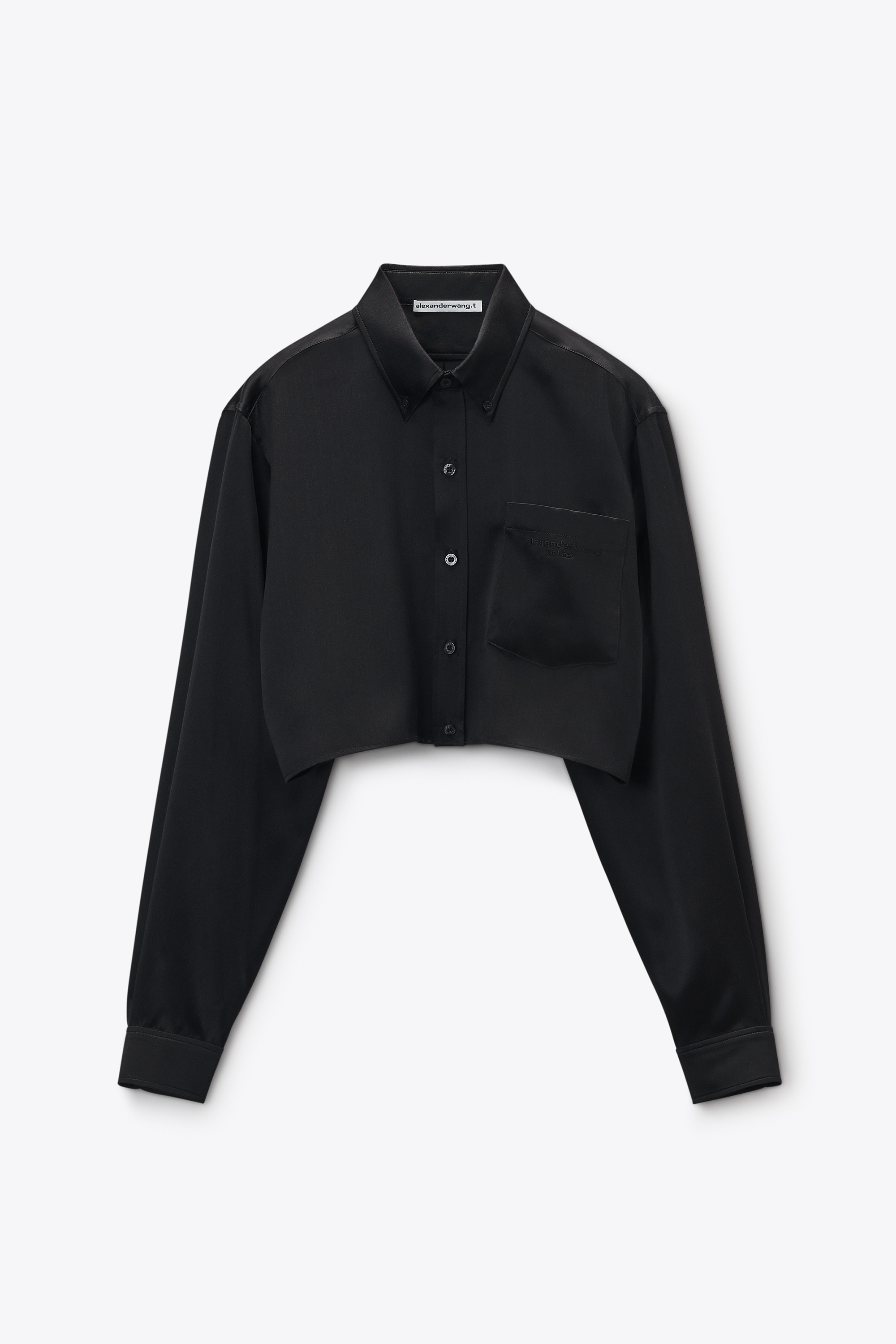 Boyfriend-style cropped shirt in black silk charmeuse with tonal logo embroidery at the chest pocket. Designed with single-needle edge stitching at the collar and shoulder seams, and finished with a box pleat at the back yoke for soft structure. - single-needle edge stitching at collar - chest pocket with tonal logo embroidery - button placket - box pleat at center back yoke - body composition: 100% silk - model is 5'11" and wears a size 4 - made in China - 4WC4251161001 composition Body: 100%SILK