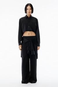 Boxer-style pant crafted in black silk charmeuse with a pre-styled shirt construction tied at the waist. Designed with a mid-rise fit and floor-length stacking, the spliced button-up shirt element is sewn into the side seams and ruched at the back for added shape. A logo elastic waistband and faux fly detail complete the look. - logo elastic waistband, faux fly - shirt sleeves with classic tower placket and functional cuffs - shirt seamed into pant side seam - body composition: 100% silk - model is 5'11" and wears a size S - made in China - 4WC4254934001 composition Body: 100%SILK Body 2: 100%SILK Elastic: 50%POLYAMIDE/41%POLYESTER/9%ELASTANE