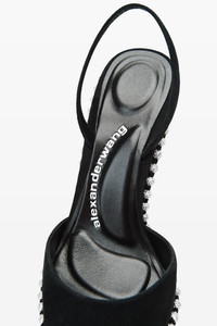 black suede slingback heel with a 105mm stiletto and crystal ball chain trim. finished with a pointy toe, leather footbed, and leather outsole for a sharp, elevated silhouette. - pointy toe - upper: suede - lining: sheep leather - outsole: cow leather - heel height: 105mm/4in - made in China - 30425P027001 composition Upper: 100%SHEEP SUEDE (OVIS ARIES ARIES) Lining: 100%Sheep Leather (Ovis Aries Aries) Outsole: 100%COW LEATHER