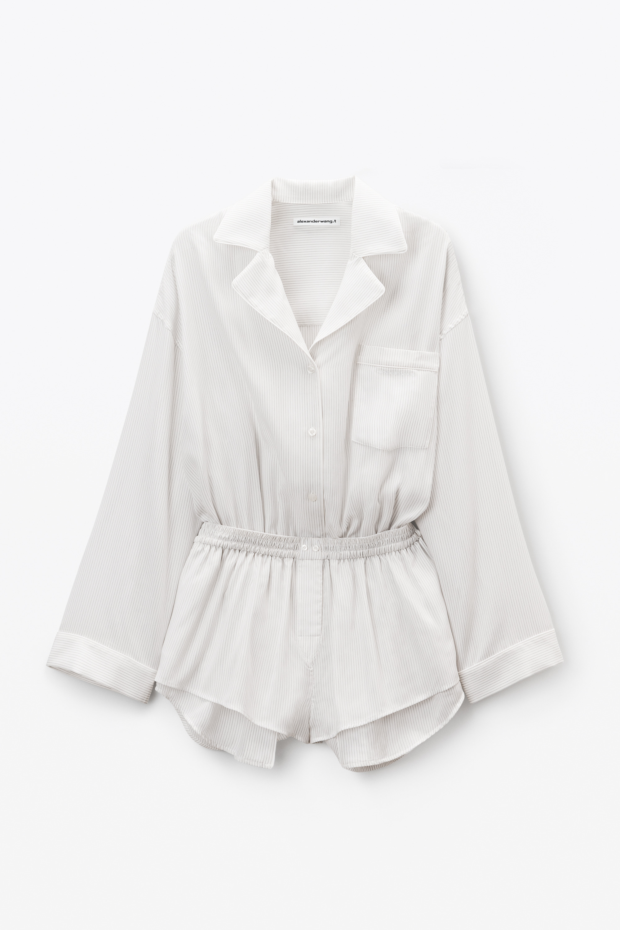This black and white pre-styled pajama romper with boxer shorts features a notched collar, a logo-detailed chest pocket, and a button-front closure. - notched collar - short sleeves - body composition: 100% lyocell - made in china - model is 5'11" and wears a size s - 4WC3256788971 composition Body: 100%LYOCELL