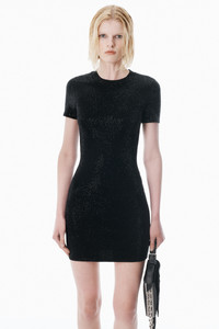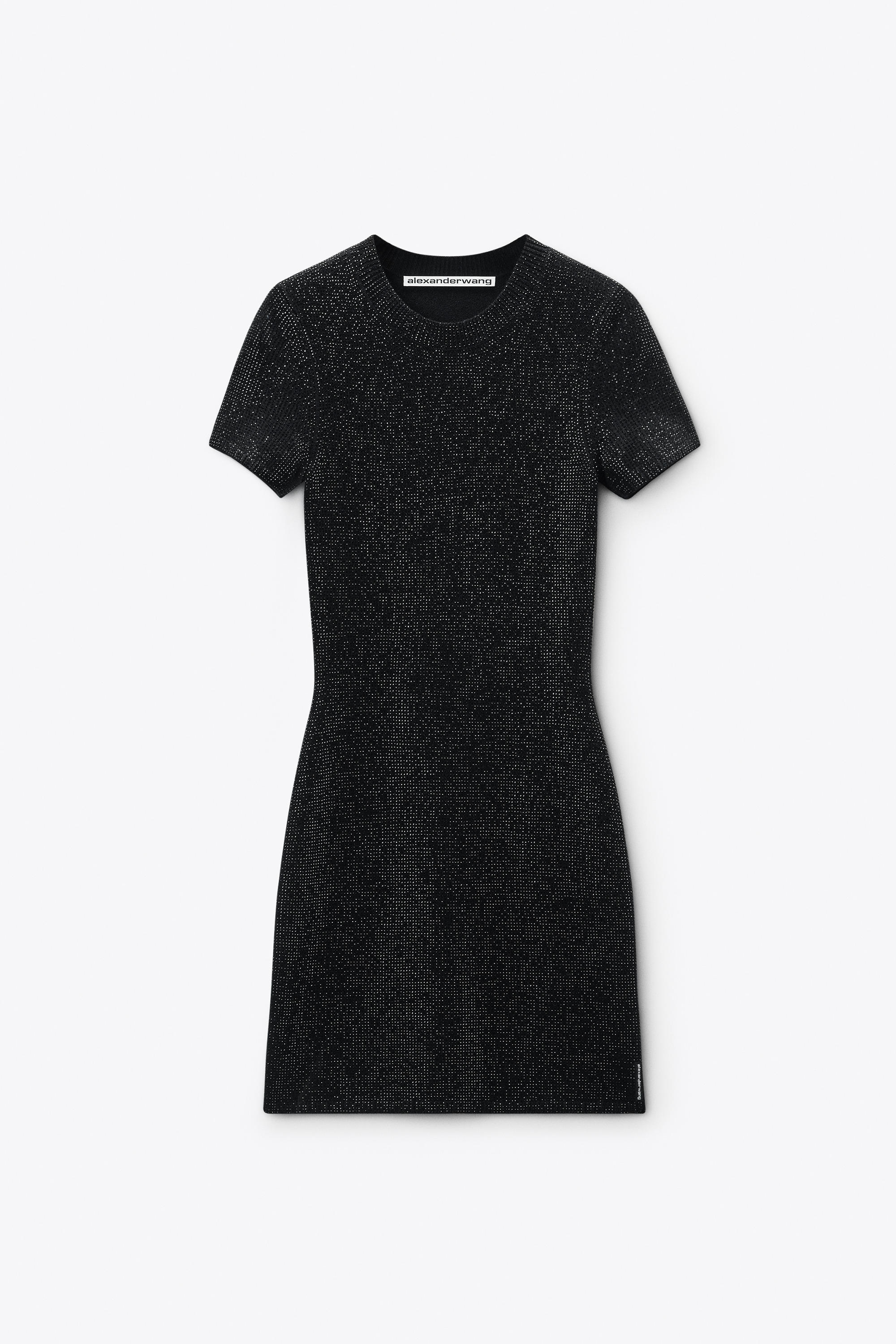 Designed in black boiled wool, this mid-weight ribbed crewneck dress features short sleeves and a fitted thigh-length silhouette. Over 79,000 crystal hotfix embellishments cover the surface, while rib trims and a woven alexanderwang logo tag finish the look. - crewneck - short sleeves - pulls on - hits at thigh - body composition: 92% wool / 7% polyamide / 1% elastane - made in China - model is 5'11" and wears a size s - 1KC4256065001 composition Body: 92%WOOL (OVIS ARIES ARIES)/7%POLYAMIDE/1%ELASTANE Rib: 92%WOOL (OVIS ARIES ARIES)/7%POLYAMIDE/1%ELASTANE