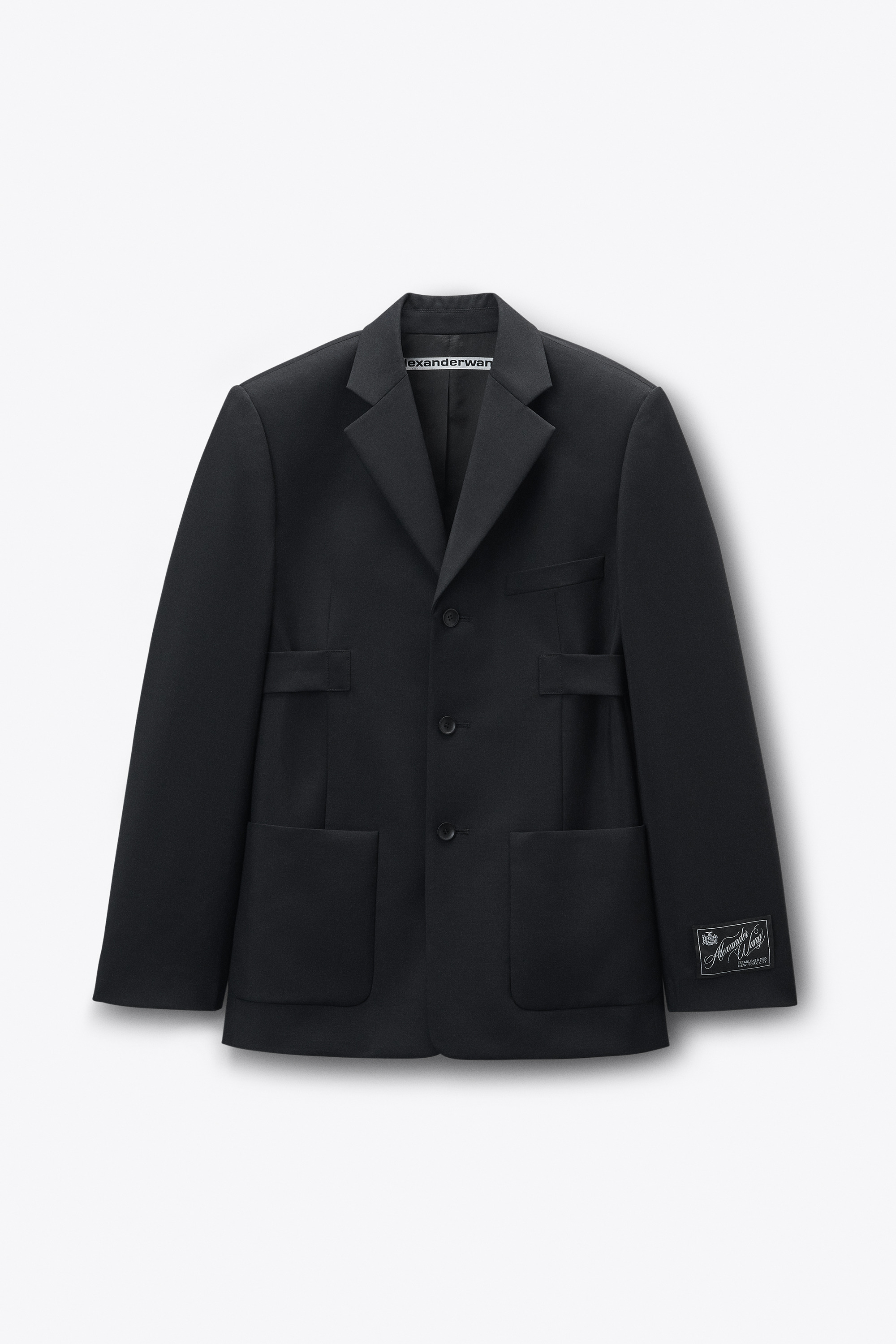 tailored in black wool mohair suiting, this structured blazer features a center-front button closure and adjustable back tabs. three patch-style pockets and branded tailoring details complete the silhouette. - single welt chest pocket - two front patch pockets - three-button front closure - adjustable back tabs - three-button cuffs - branded tailoring label at cuff - single back vent - body composition: 77% wool / 23% mohair - model is 5'11" and wears a size s - made in China - 1WC4252673001 composition Body: 77%WOOL (OVIS ARIES ARIES)/23%MOHAIR Lining: 100%VISCOSE