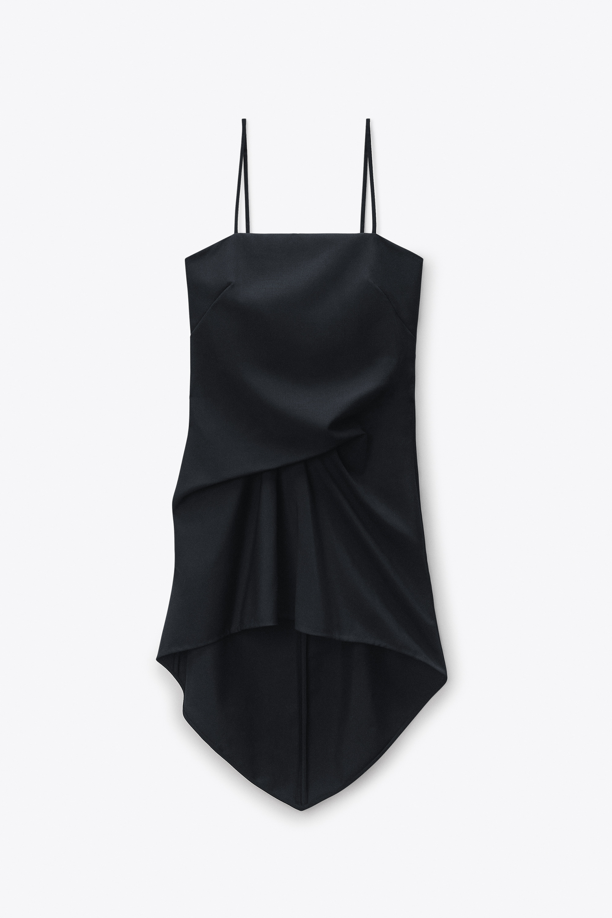 Dress crafted in black wool mohair suiting with a gathered tuck at the low waist and a pointed asymmetric hem. Designed with a straight neckline and delicate spaghetti straps, it's finished with an invisible center back zip for a sculpted, architectural fit. - straight neckline - spaghetti straps - center back zip closure - internal dart construction - pointed asymmetric hem - body composition: 77% wool / 23% mohair - model is 5'11" and wears a size 4 - made in China - 1WC4256868001 composition Body: 77%WOOL (OVIS ARIES ARIES)/23%MOHAIR Lining: 100%POLYAMIDE
