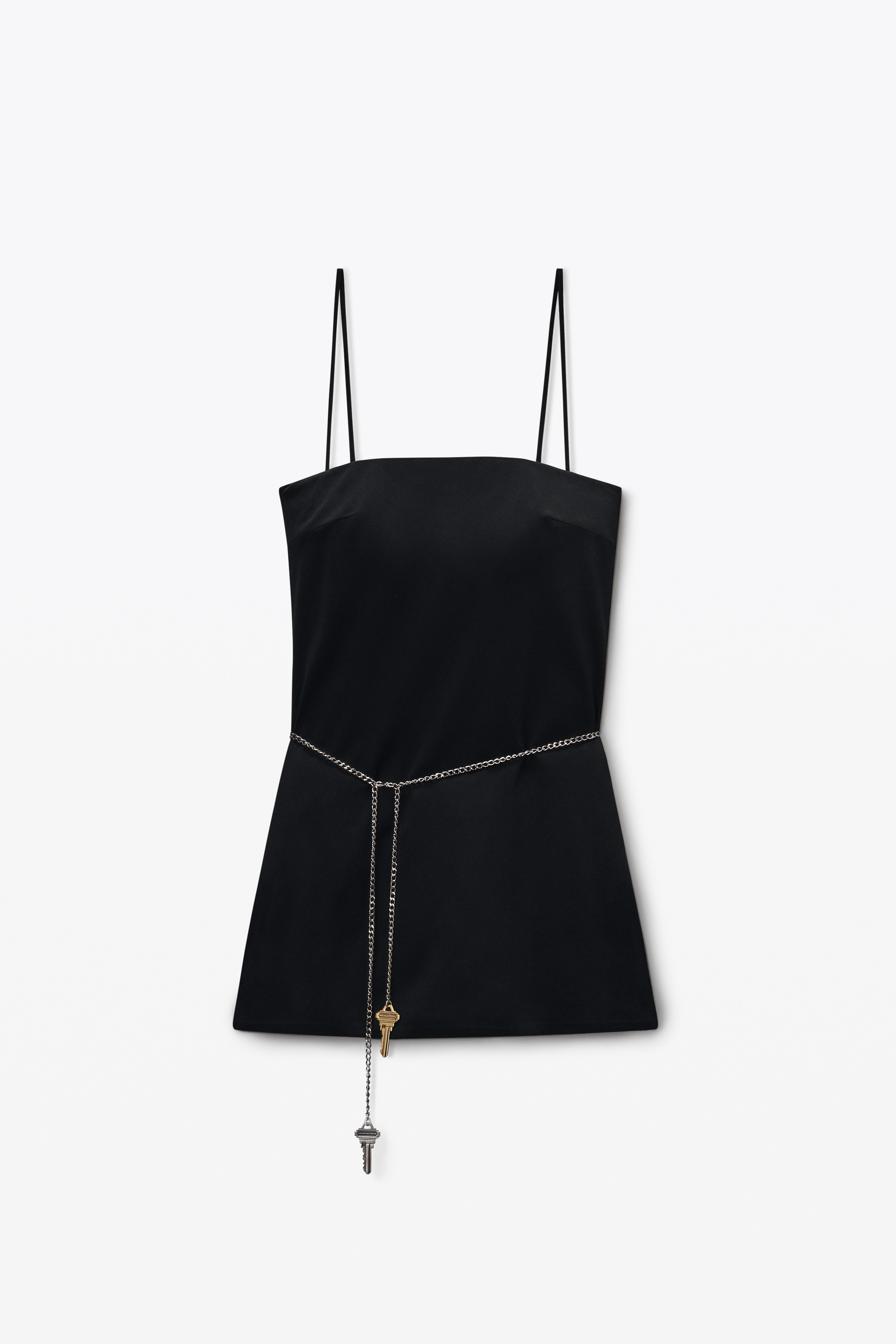 This tropical stretch wool-blend minidress in black is lined with a power mesh corset for structure, removable straps, and internal shorts. A chain-link belt with branded key detailing characterizes this style. - detachable straps - concealed back zip - slide-slip pockets - body composition: 86% wool/9% polyamide/5% elastane - lining: 100% viscose - lining 2: 75% polyamide/25% elastane - made in china - model is 5’11" and wears a size 4 - 1WC3256846001 composition Body: 86%WOOL (OVIS ARIES ARIES)/9%POLYAMIDE/5%ELASTANE Lining: 100%VISCOSE Lining 2: 25%ELASTANE/75%POLYAMIDE