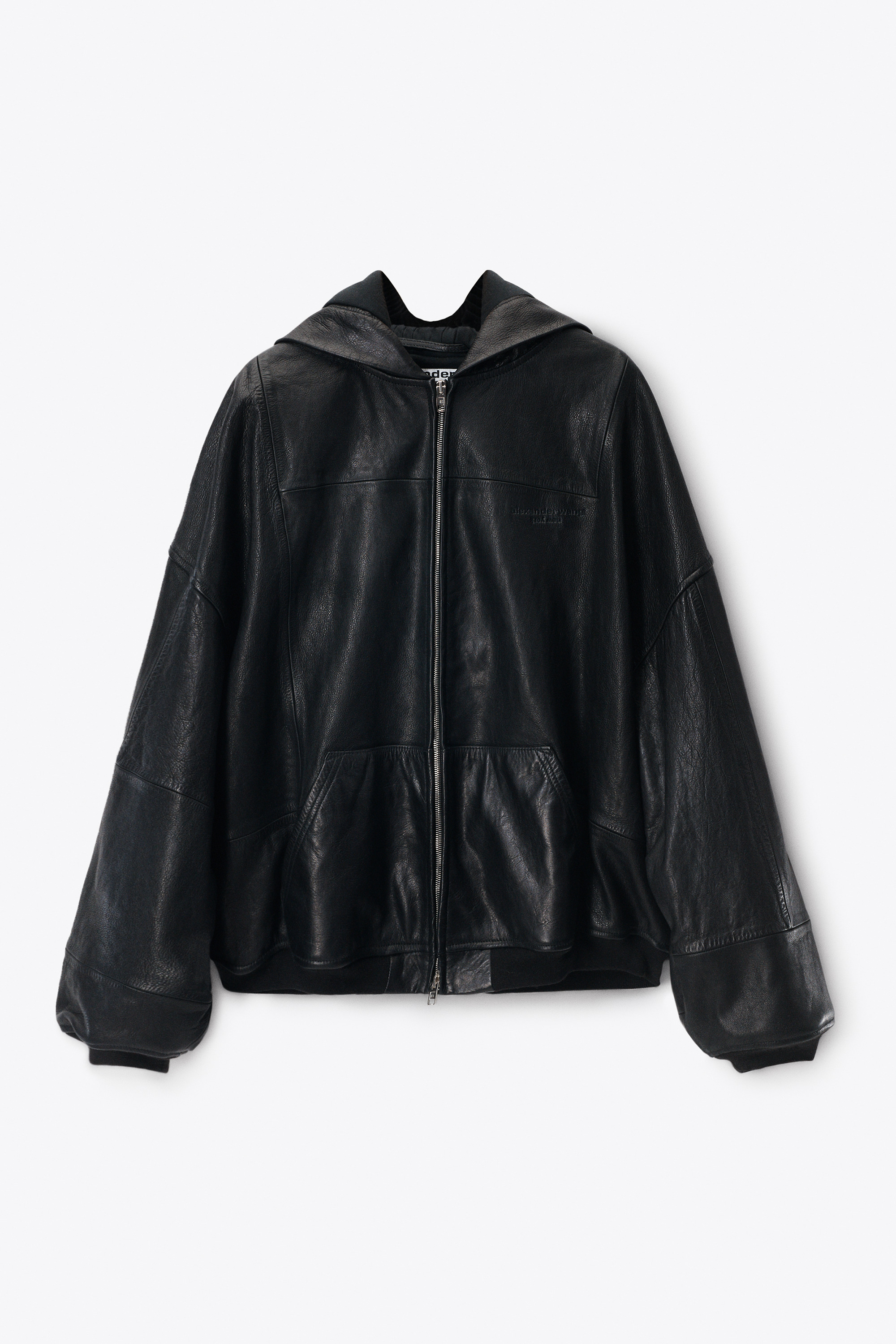 Oversized hoodie jacket crafted in black worn moto leather with dropped shoulders and patchwork seaming. Designed with articulated sleeves, a center front zip closure, and a kangaroo pocket. Finished with ribbed cuffs and hem, a fully lined interior, and a debossed classic logo at the chest. - unisex fit - hood - ribbed cuffs - kangaroo pocket - front-zip closure - oversize fit - fully lined - body composition: cow leather - female model is 5'11" and wears a size S - male model is 6'1" and wears a size m - made in India - UWC4252069001 composition Body: 100%COW LEATHER Rib: 82%WOOL (OVIS ARIES)/17%POLYAMIDE/1%ELASTANE Lining: 100%COTTON Filling: 100%POLYESTER