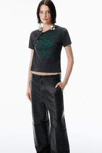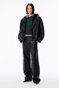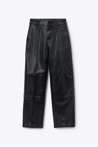 Mid-rise workwear-inspired pant rendered in black worn moto leather with a crisp, boxy fit. Features a pressed crease surface effect, reinforced knee panels, and multiple welt pockets. Branded woven labels at the front knee and back pocket, plus debossed logos at the waistband finish the look. Half lined. - elastic waistband - side slash and back welt pockets - boxy fit - body composition: cow leather - made in India - model is 5'11" and wears a size 4 - 1WC4254913001 composition Body: 100%COW LEATHER Lining: 100%COTTON