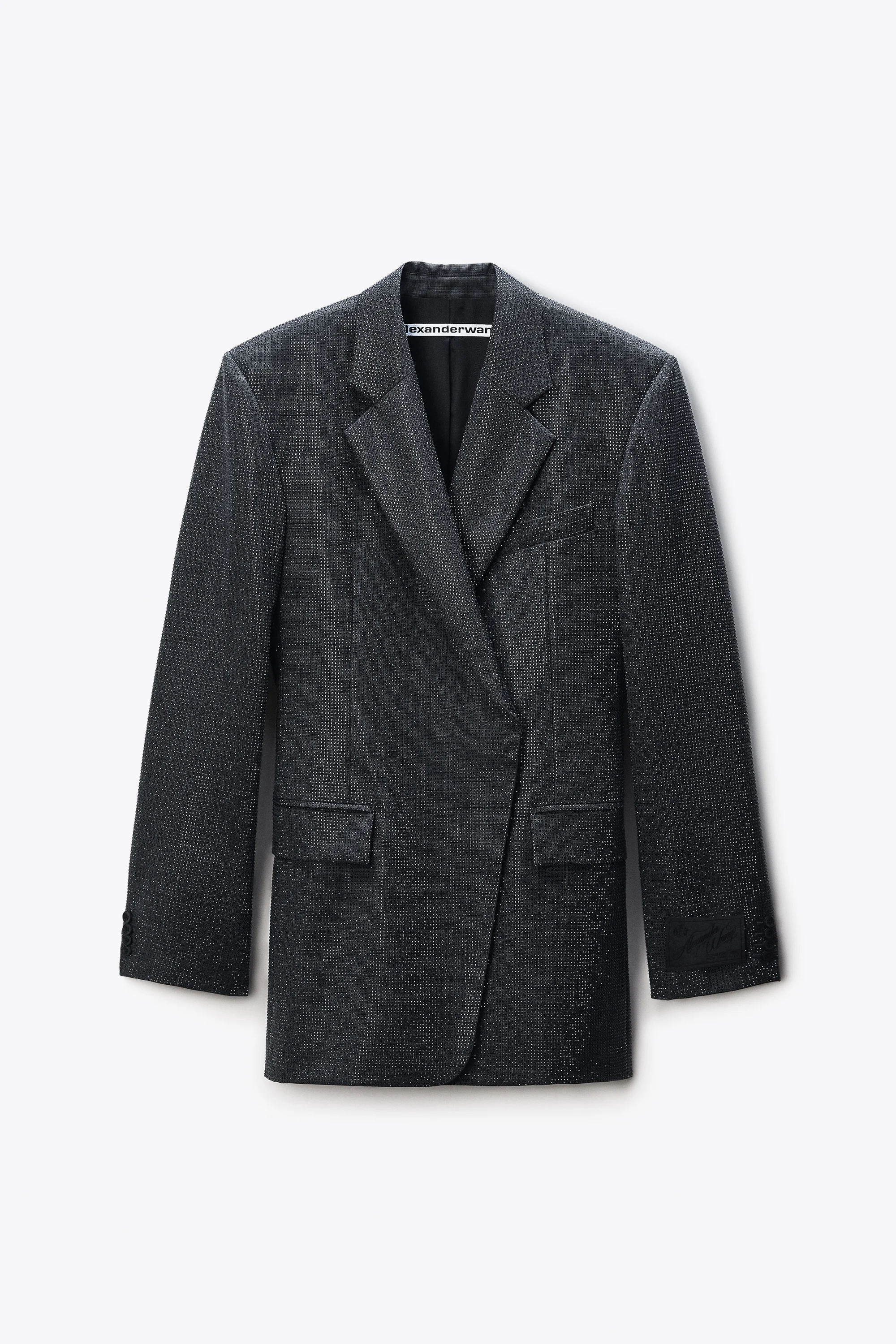 Grey wool mohair suiting mini dress embellished with allover clear hotfix. Tailored with a double-breasted lapel, hidden closure, and sharp pocket detailing, the silhouette balances structure with light-catching surface. - Grey - Double-breasted lapel - Welt and flap pockets - Fully lined - Body composition: 77% wool / 23% mohair - Lining: 100% viscose - Made in China - Model is 5'11" and Wears a Size 4 - 1WC1266898020 composition Body: 77%WOOL (OVIS ARIES ARIES)/23%MOHAIR Lining: 100%VISCOSE
