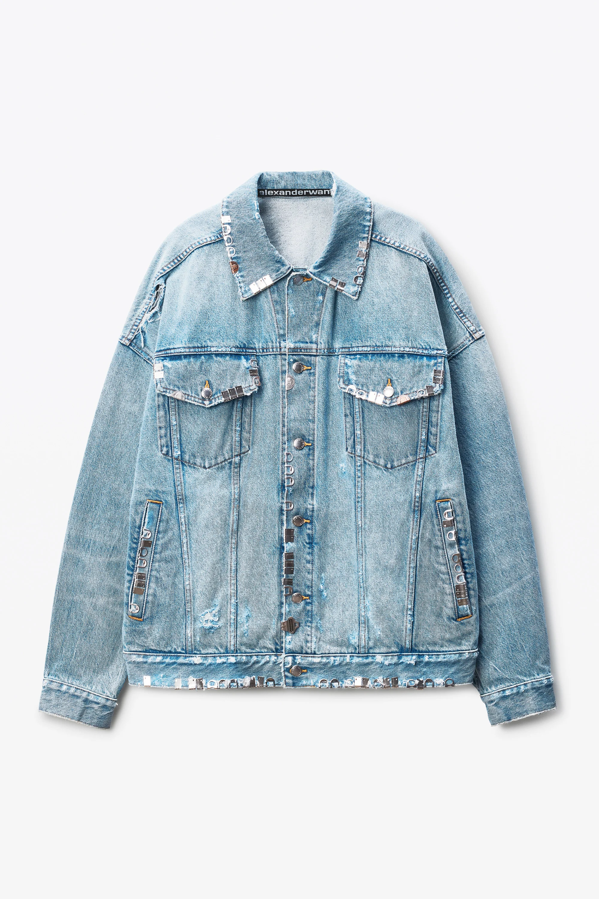 This powder blue trucker jacket features hand-appliqued hardware punctuating the oversized style. Wide dropped shoulder seams accentuate the look of this outerwear statement piece. - sprad collar - long sleeves - shank button placket - flap and welt pockets - 100% cotton - one size - made in china - UDC3252778496A composition Body: 100%COTTON Rib: 99%COTTON/1%ELASTANE