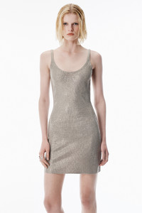 Champagne matte rayon dress in a fine gauge interlock stitch with a scoop neckline and fitted silhouette. Designed with subtle rib trim at the edges, this lightweight piece balances sleek structure with fluid movement. - scoop neckline - sleeveless - pulls on - hits at mid-thigh - body composition: 100% viscose - model is 5'11" and wears a size s - made in China - 1KC4256014255 composition Body: 100%VISCOSE Rib: 77%VISCOSE/21%POLYAMIDE/2%ELASTANE