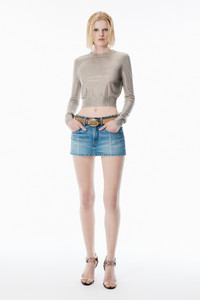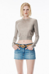 Champagne matte rayon pullover in a fine gauge jersey stitch with a crew neckline and long sleeves. Covered in over 160,000 crystal hotfix embellishments, this waist-length knit features classic 1x1 rib trims and delivers a hand-finished look with elevated texture. - crewneck - long sleeves - hits at waist - 100% viscose - model is 5'11" and wears a size s - made in China - 1KC4251070255 composition Body: 100%VISCOSE Rib: 77%VISCOSE/21%POLYAMIDE/2%ELASTANE
