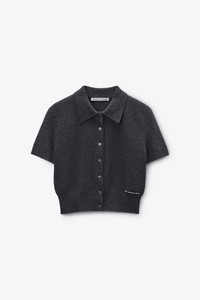 Mid-weight polo cardigan in charcoal wool with short sleeves and a clean, structured finish. Features a full-needle rib collar, logo buttons at the center front placket, and a knit version of the alexanderwang flag tag at the bottom hem. - full-needle rib collar - logo buttons at center front placket - short sleeves - body composition: 100% wool - model is 5'11" and wears a size S - made in China - 4KC4251061010 composition Body: 100%WOOL (OVIS ARIES ARIES) Rib: 2%ELASTANE/18%POLYAMIDE/80%WOOL (OVIS ARIES ARIES)