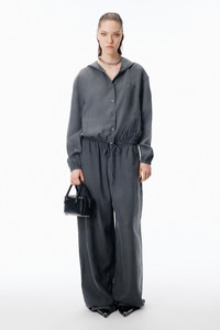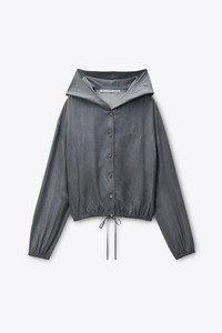 Thunder grey cropped hoodie in pigment-coated silk. The relaxed silhouette meets elevated fabrication, balancing laid-back ease with polished finish. - Thunder grey - Drawcord hood - Front button placket - Slash pockets - Elasticated hem - Body composition: 100% silk - Model is 5'11" and Wears a Size S - Made in China - 1WC1261200022C composition Body: 100%SILK