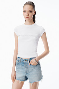 "White cotton baby rib tee in a shrunken short sleeve silhouette. Designed with a rib crewneck and a crystal degrade logo at the center chest. An easy, close-fitting layer with subtle shine. - White - ribbed crewneck - short sleeves - shrunken fit hits at waist - straight hem - body composition: 100% cotton - trim: 100% cotton - model is 5'11"" and wears a size s - made in portugal - 1CC1261209100 " composition Body: 100%COTTON Rib Trim: 100%COTTON