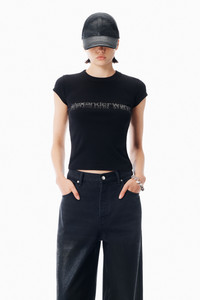 "Black cotton baby rib tee in a shrunken short sleeve silhouette. Designed with a rib crewneck and a crystal degrade logo at the center chest. An easy, close-fitting layer with subtle shine. - Black - ribbed crewneck - short sleeves - shrunken fit hits at waist - straight hem - body composition: 100% cotton - trim: 100% cotton - model is 5'11"" and wears a size s - made in portugal - 1CC1261209001 " composition Body: 100% COTTON Rib Trim: 100%COTTON
