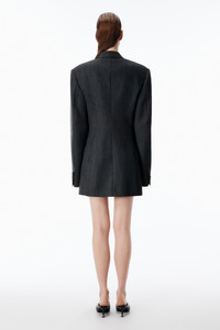 heritage wool twill in black and charcoal tailored into a fitted mini blazer dress with a double-breasted lapel. designed with sharp pocket detailing and finished with branded tailoring touches, it offers a structured take on after-dark dressing. - Black/Charcoal - double-breasted lapel with hidden button closure - welt chest pocket at left side - front hip flap pockets - four-button sleeve cuffs - mini length fitted silhouette - body composition: 100% wool - lining: 100% viscose - Made in China - Model is 5'11" and Wears a Size 4 - 1WC1266880019E composition Body: 100%WOOL (OVIS ARIES ARIES) Lining: 100%VISCOSE