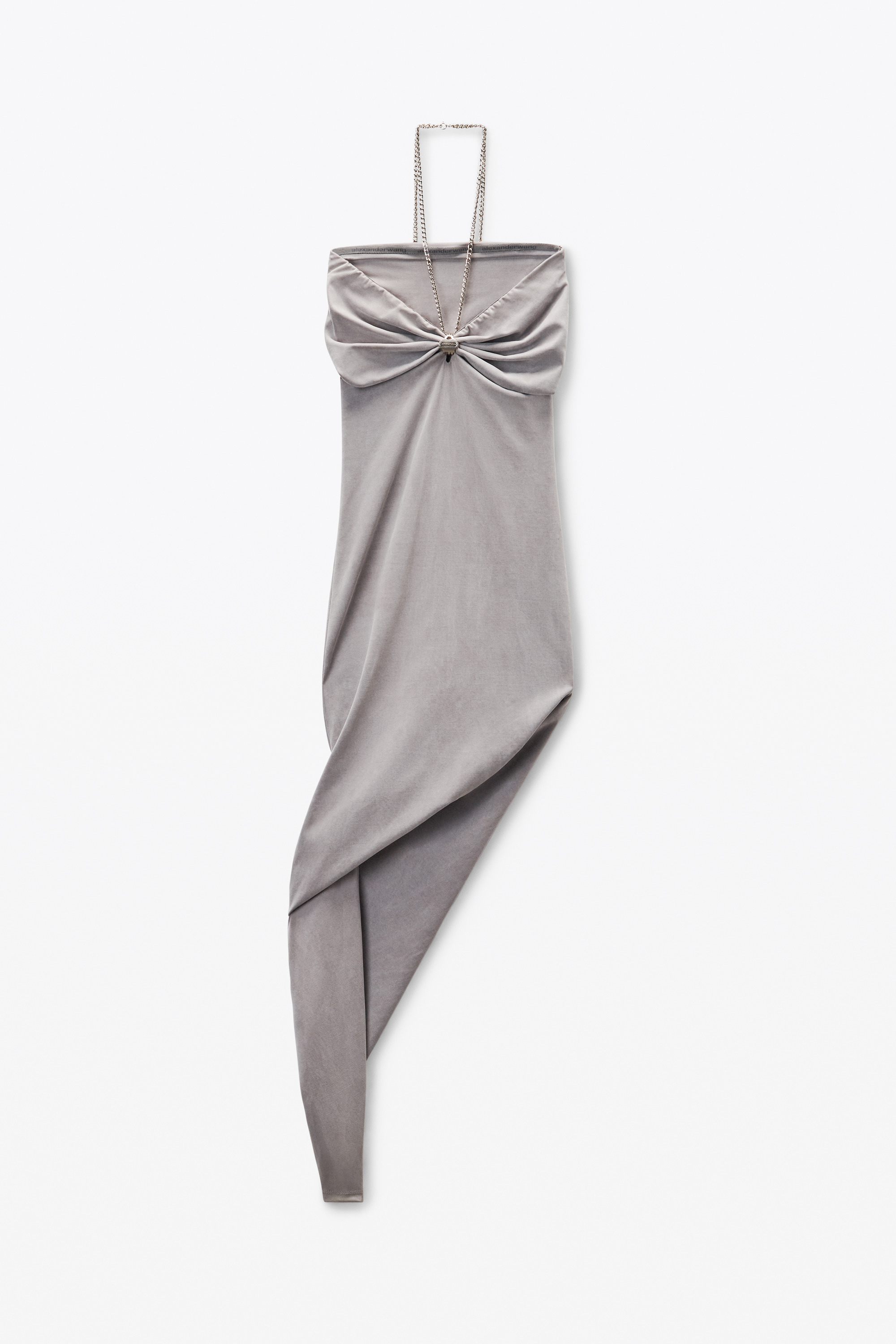 Crafted from sueded jersey in cement, this asymmetric dress features detachable chain-link hardware with logo-detailed key pendants gracefully draped at the back - sweetheart neckline - sleeveless - key pendant necklace - body composition: 89% lyocell/11% elastane - made in china - model is 5'11" and wears a size s - 1CC3256849926 composition Body: 89%LYOCELL/11%ELASTANE