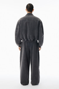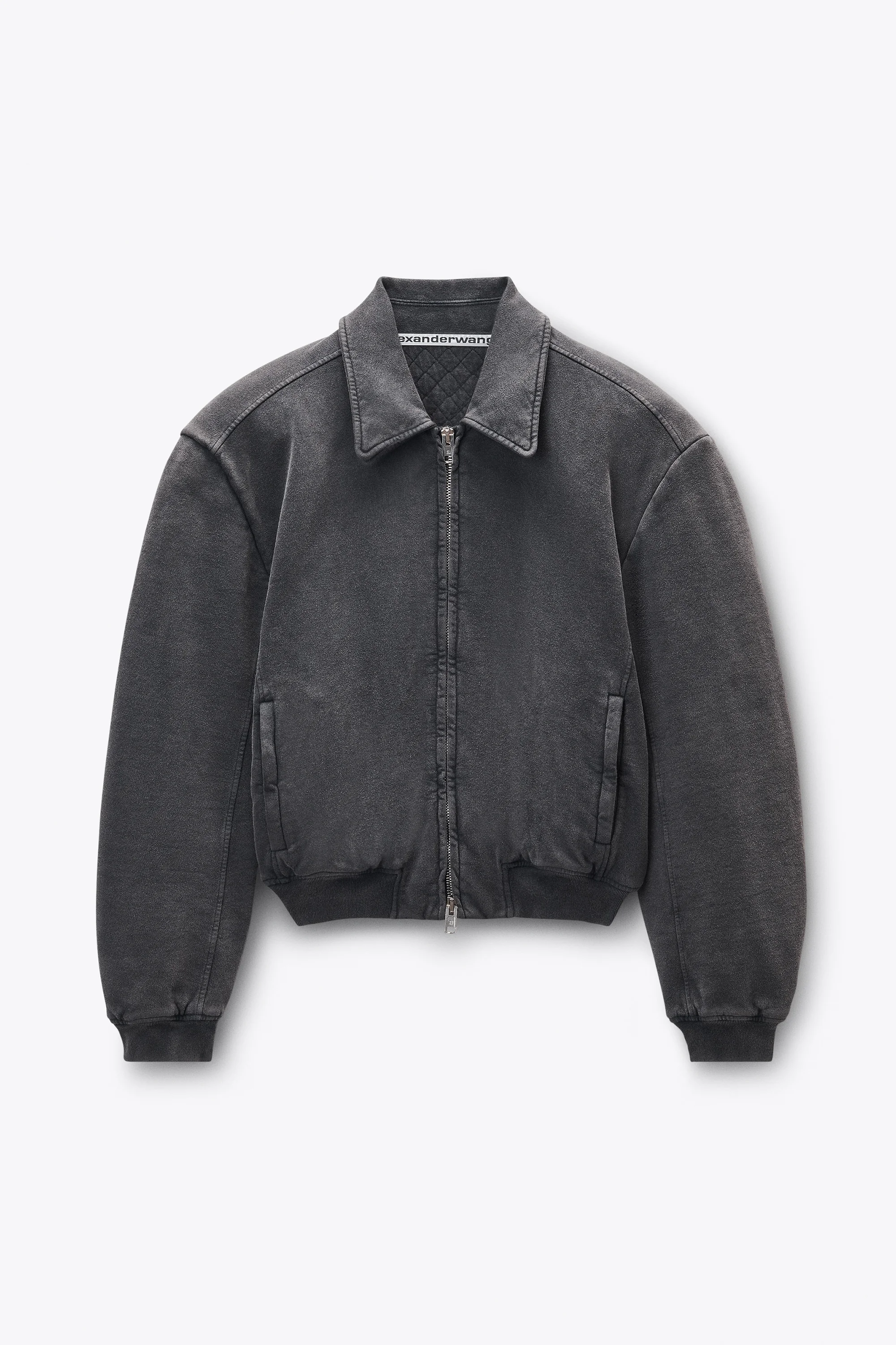 Washed asphalt dry terry cut into an oversized moto shape. Padded shoulders and rounded sleeves push volume forward; a two-way zip and quilted lining keep it grounded. - coach collar - two-way center front zip closure - rounded, two-piece sleeve - single welt pockets at waist - ribbed hem and cuffs - quilted lining - female model is 5'11" and wears a size s - male model is 6'2" and wears a size m - body composition: 100% cotton - made in Portugal - UCC4252688029C composition Body: 100%COTTON Rib: 99%COTTON/1%ELASTANE Lining: 100%COTTON Filling: 100%POLYESTER