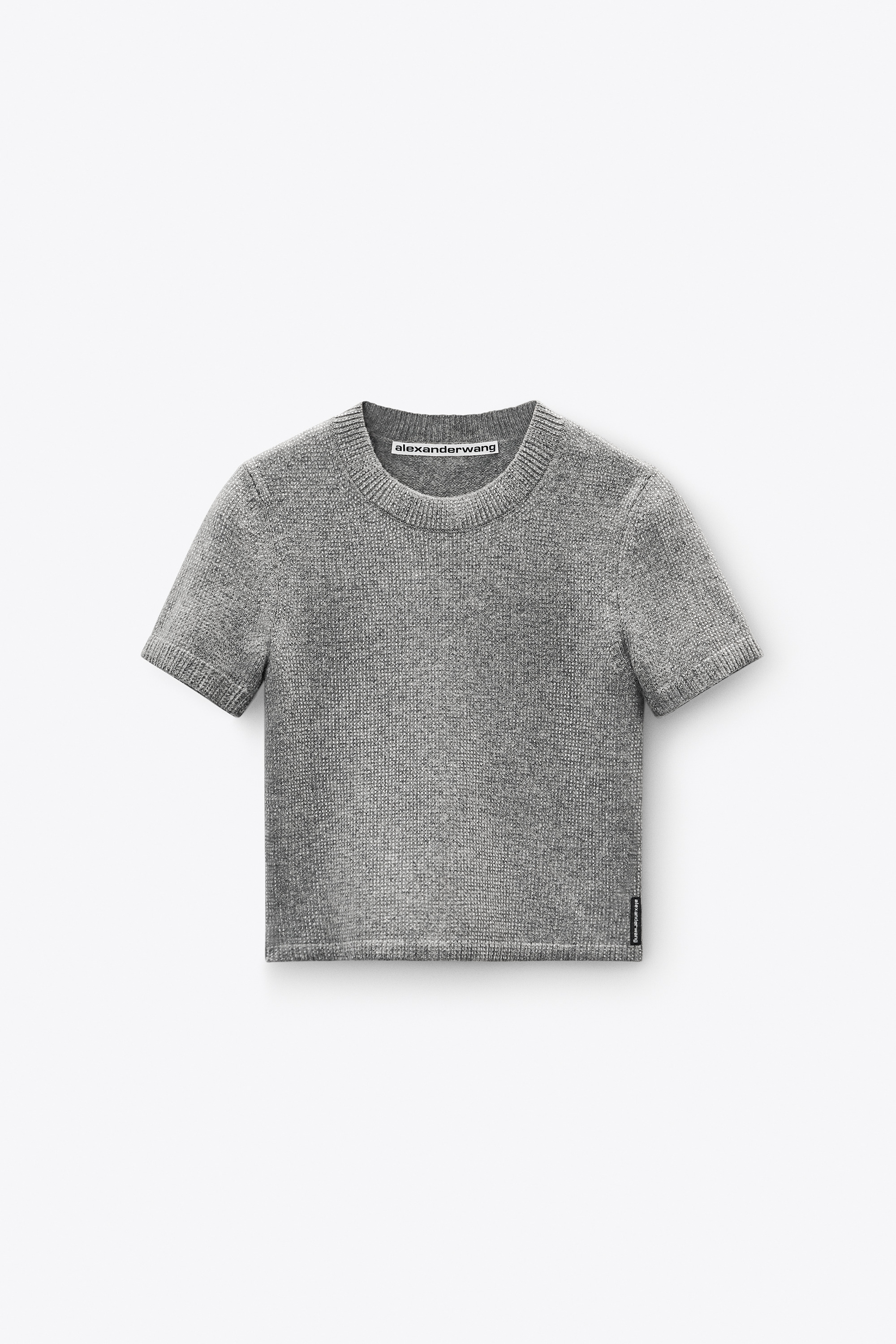 Heather grey boiled wool ribbed tee cut in a mid-weight knit with a close, fitted silhouette. Features over 48,000 allover hotfix embellishments and classic rib trims, finished with a woven alexanderwang logo at the left side seam. - crewneck - short sleeves - body composition: 92% wool / 7% polyamide / 1% elastane - rib trim: 92% wool / 7% polyamide / 1% elastane - made in China - model is 5'11" and wears a size s - 1KC4251022030 composition Body: 92%WOOL (OVIS ARIES ARIES)/7%POLYAMIDE/1%ELASTANE Rib: 92%WOOL (OVIS ARIES ARIES)/7%POLYAMIDE/1%ELASTANE