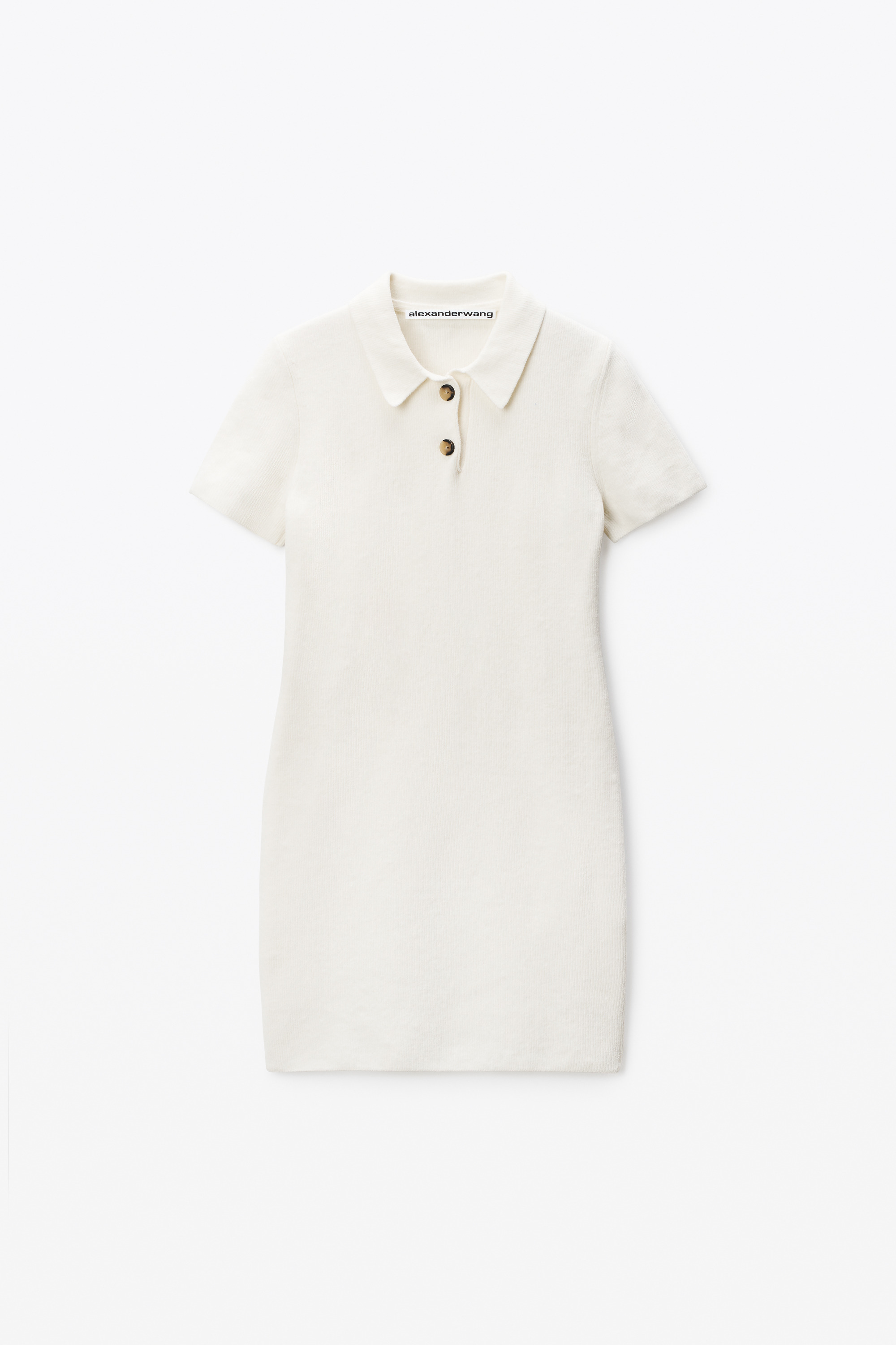 The cotton-blend chenille construction offers a breathable, trans-seasonal layering option, revealing dimensional tonal contrasts in this ivory polo dress. - button placket - short sleeves - pull-over style - body composition: 88% cotton/10% polyamide/2% elastane - made in china - model is 5'11" and wears a size s - 1KC3256066106 composition Body: 88%COTTON/10%POLYAMIDE/2%ELASTANE