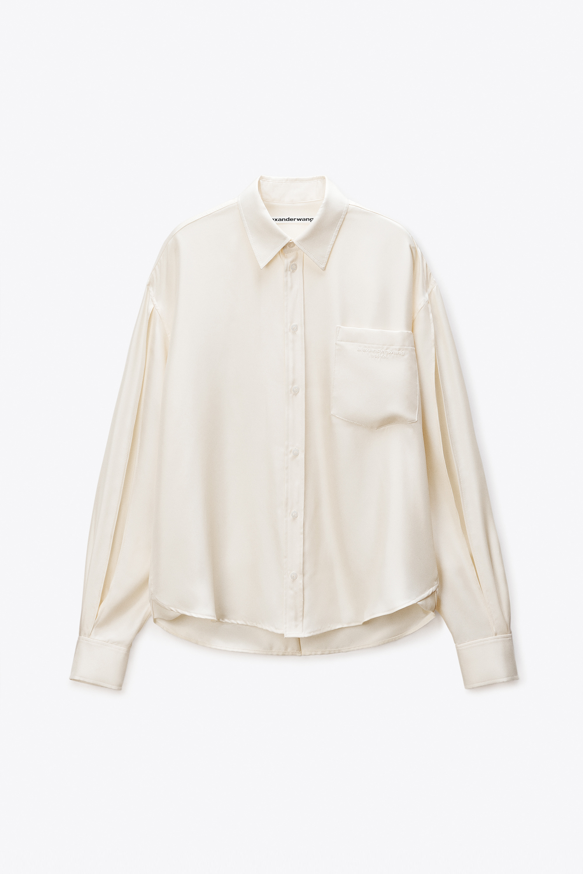 Menswear-inspired button-up shirt rendered in pure ivory silk with slashed sleeves that can be styled open for an exposed arm. Designed with a chest pocket featuring tonal alexanderwang logo embroidery, and finished with a classic placket and tower cuff closures. - shirt collar - button-front placket - tower placket cuffs - body composition: 100% silk - made in China - model is 5'11" and wears a size s - 1WC4251152106 composition Body: 100%SILK