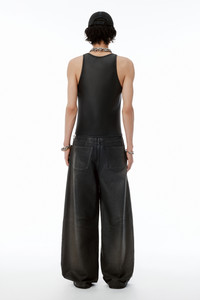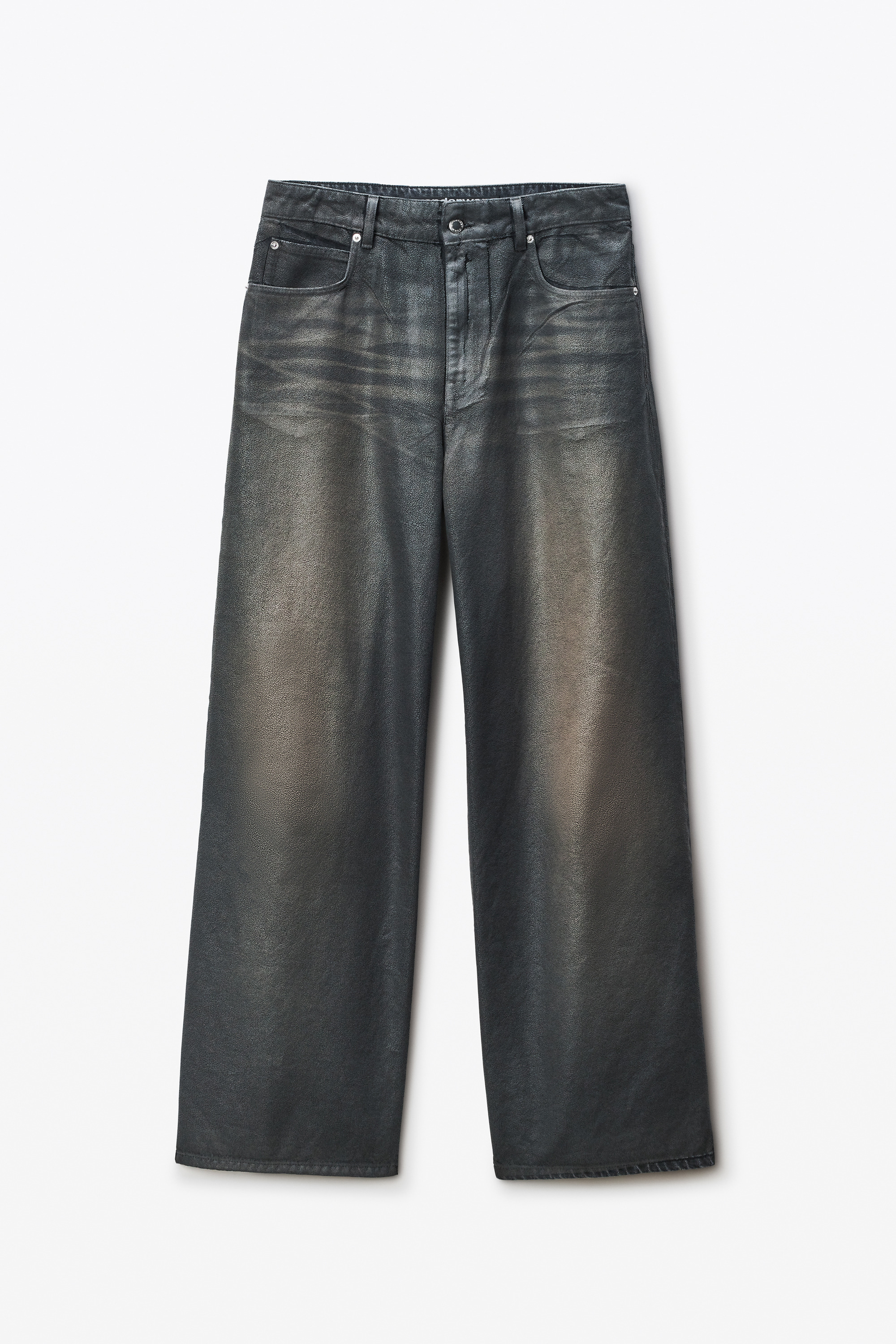 these denim jeans in vintage black use an artisan pigmentation coating technique and heat pressing to mimic the look and feel of leather. they feature a straight, wide leg that stacks at the cuff, and are detailed with five-pocket styling, a zip fly, and a logo patch at the back. - five-pocket style - front fly - body composition: 100% cotton - coating: 100% polyurethane - made in italy - model is 6'1" and wears a size 32 - 6DC3254807011D composition Body: 100%COTTON Coating: 100%POLYURETHANE