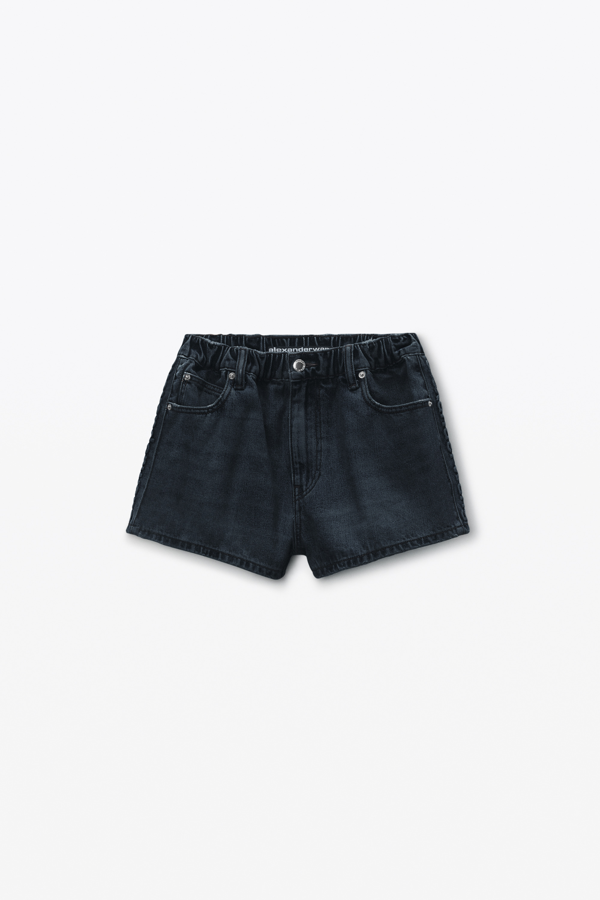 these marathon shorts in a grey aged denim boast logo embossed side panels elevating this casual denim separate. This style features a five-pocket design and is fastened with an elastic waistband. - five-pocket style - belt loops - zip fly, button closure, elastic waistband - body composition: 100% cotton - relaxed fit, hits at waist - made in China - model is 5'10" and wears a size 27 - inseam: 2.75'' - 4DC3254883015 composition Body: 100%COTTON