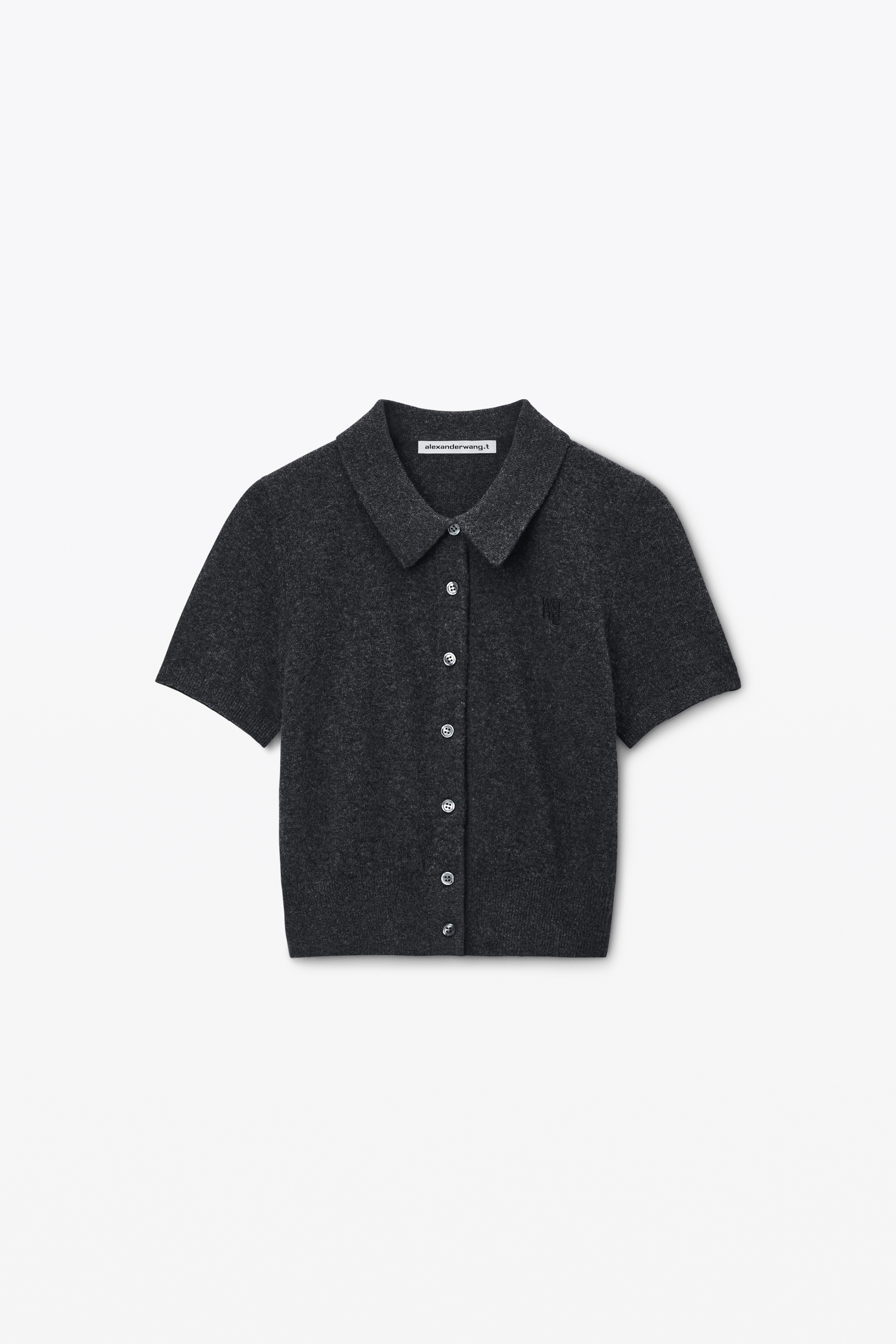 A high-frequency stacked logo defines this short-sleeve charcoal polo cardigan fastened with shell buttons and finished with rib trim. - polo collar - short sleeves - relaxed fit - body composition: 100% wool - trim: 89% wool/10% polyamide/ 1% elastane - model is 5'10.5" and wears a size s - made in china - 4KC1253068010 composition Body/Exterieur: 100%WOOL (OVIS ARIES ARIES) Rib Trim: 89%WOOL (OVIS ARIES ARIES)/10%POLYAMIDE/1%ELASTANE
