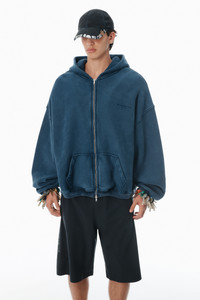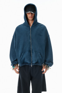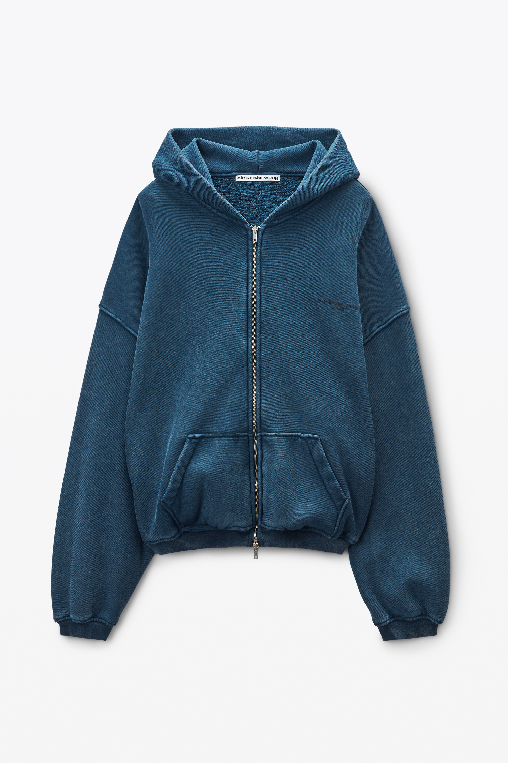 This washed navy zip-up cotton terry hoodie features layered graphics at the back, along with a logo pull and chest embroidery for added detail. - hood - long sleeves - two-way zip closure - kangaroo pockets - body composition: 100% cotton - trim: 99% cotton/1% elastane - made in portugal - model is 6'1" and wears a size m - UCC3252065421B composition Body: 100%COTTON Rib: 99%COTTON/1%ELASTANE