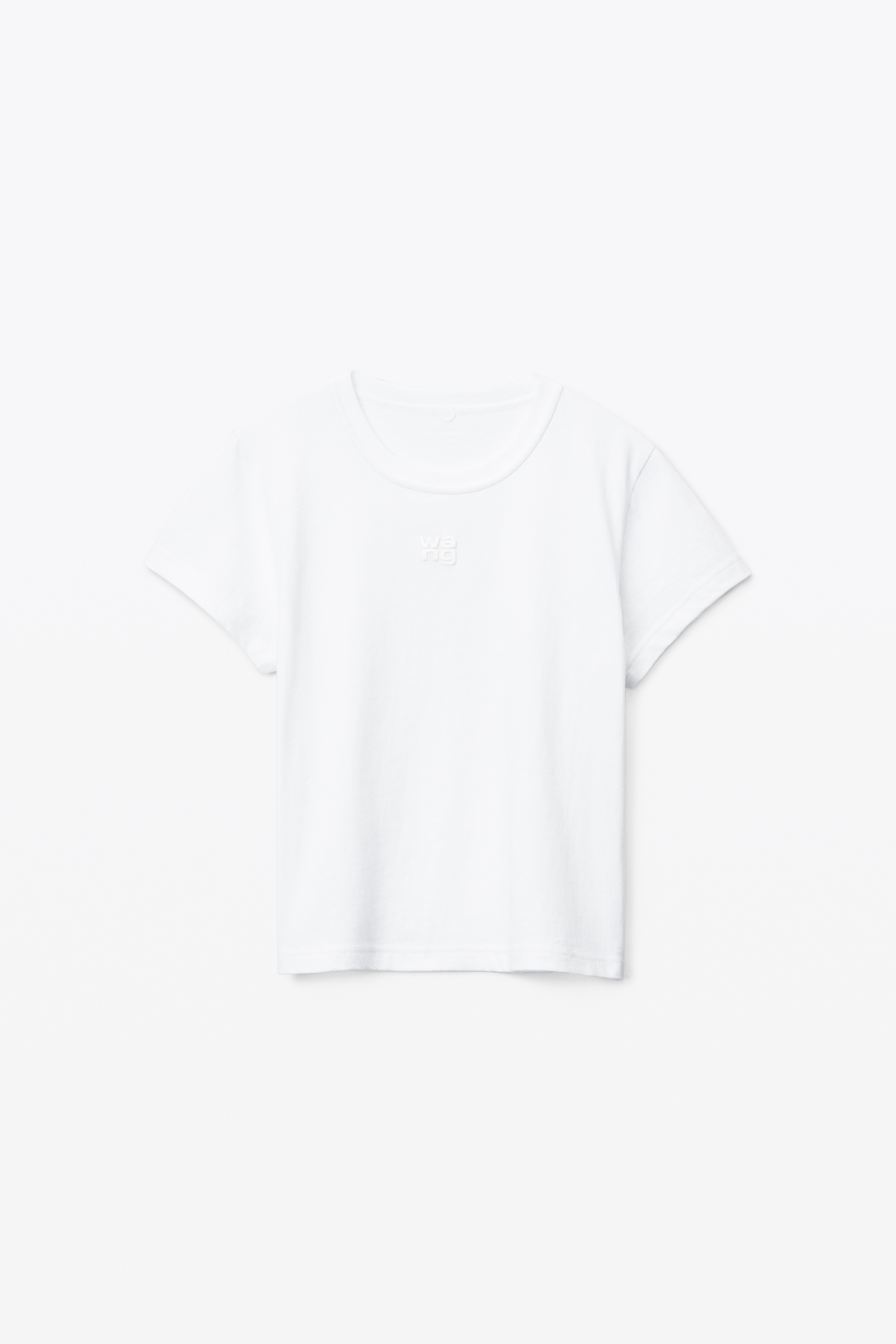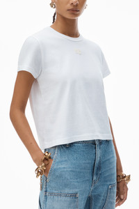 white classic short-sleeve shrunken tee in structured jersey with a stacked puff print logo at neckline - relaxed shrunken fit - hip-length bottom hem - composition: 100% cotton - made in china - model is 5'10" and wears size s - 4CC3221358100