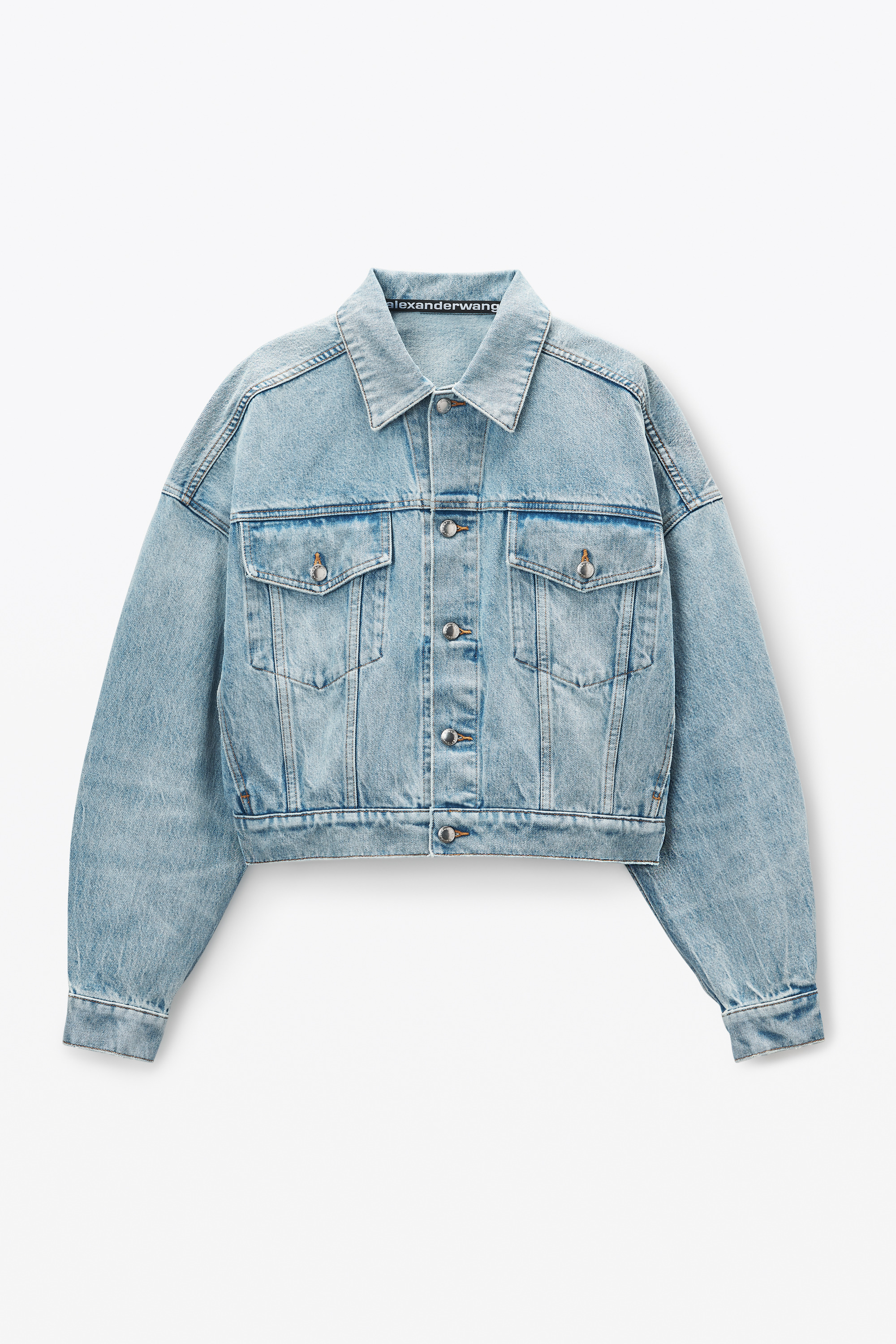 Designed with a shrunken silhouette, this vintage blue trucker jacket offers a snug fit, perfect for layering. The dropped sleeves and accentuated volume highlight the tight-fitting cropped shape, finished with chest pockets, shank buttons, and a logo patch at the back. - stand collar - long sleeves - zip closure - body composition: 100% cotton - made in china - 4DC3252777470C composition Body: 100%COTTON